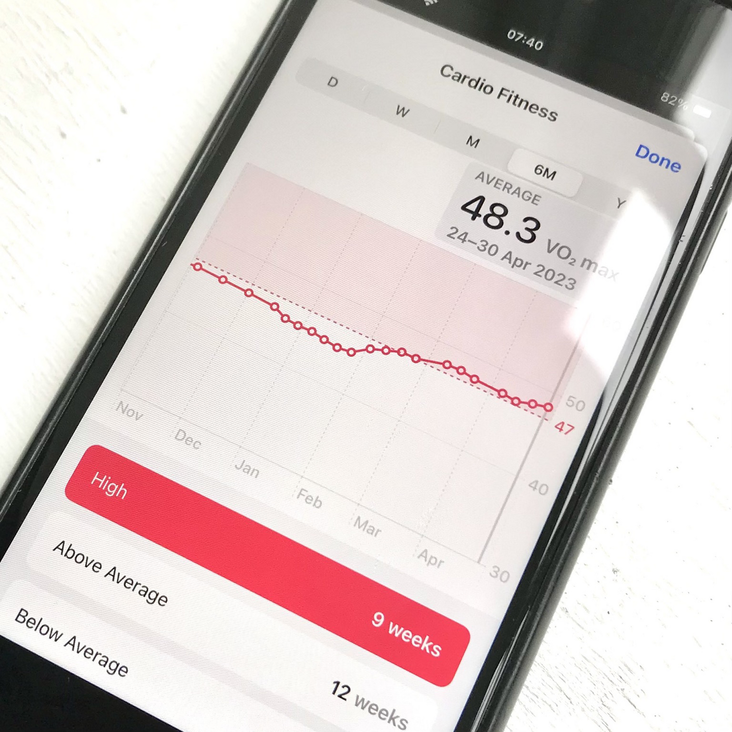 Speed work over the last few months is paying off in my cardio fitness (VO₂ max levels). From 44.4 in January to 48.3 in April; taking me from ‘Above Average’ to a ‘High’ level of cardio fitness for my age. BOOM💥IN YOUR FACE MIDDLE AGE!