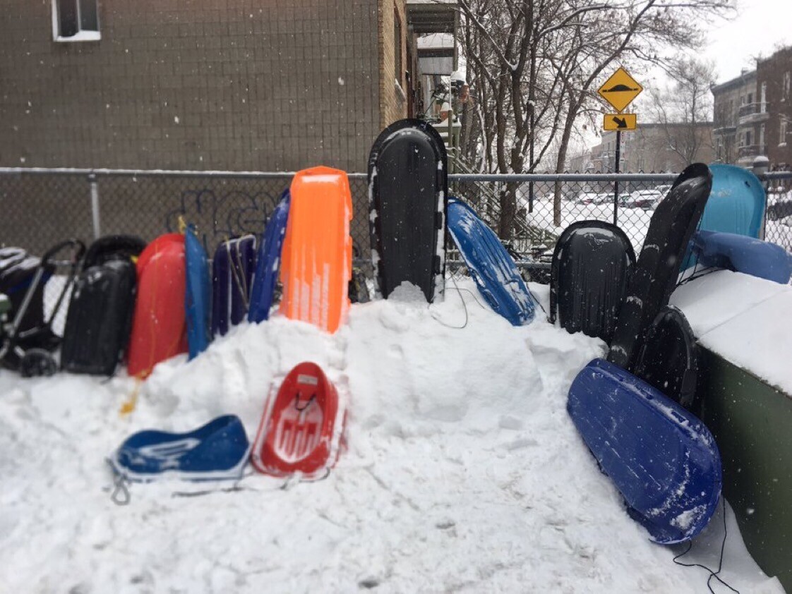 The morning commute by sled, outside daycare in #Montreal's Mile-End.
