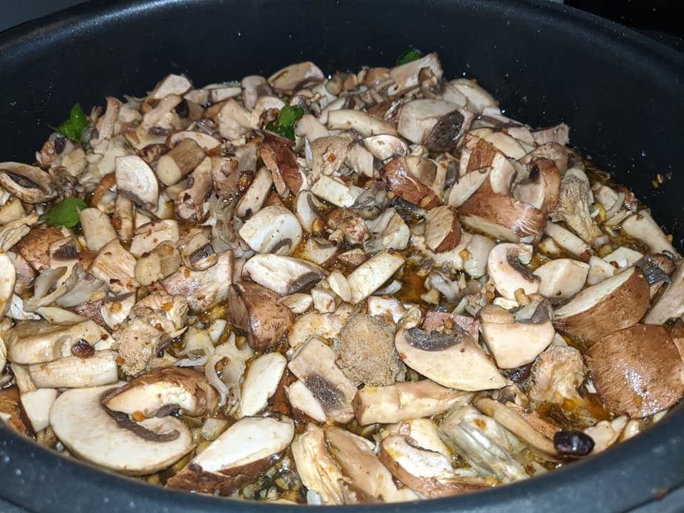 Making mushroom nut soup in the slow cooker...Made with 5 types of mushrooms (Maitake, Crimini, pioppino, Lion's Mane, and White Cap), 2 kinds of nuts (Walnut and pistachio), plus some bulgar wheat, couscous, and about half a dozen imported spices.