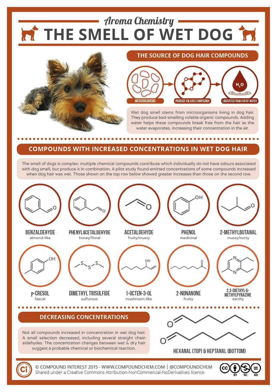 Today is #NationalPuppyDay 🐶 If you’ve ever wondered why wet dogs smell so funky, learn about the biochemistry behind it in this graphic! https://www.compoundchem.com/2015/07/28/wet-dog/