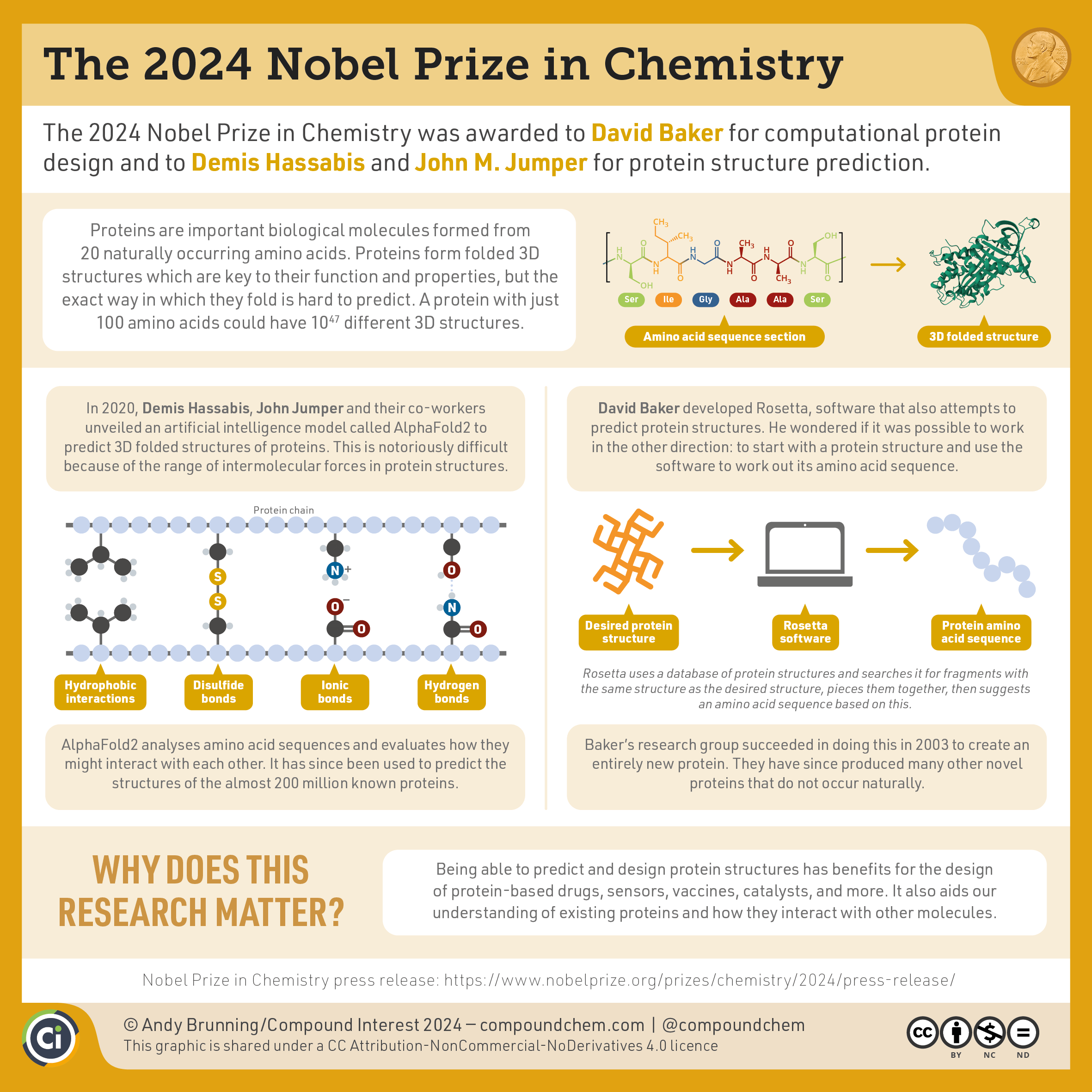 With the 2025 Nobel Prize in Chemistry being announced tomorrow, here's a reminder of the research on protein structure prediction that won last year's prize: https://www.compoundchem.com/2024/10/10/2024nobelchemistry