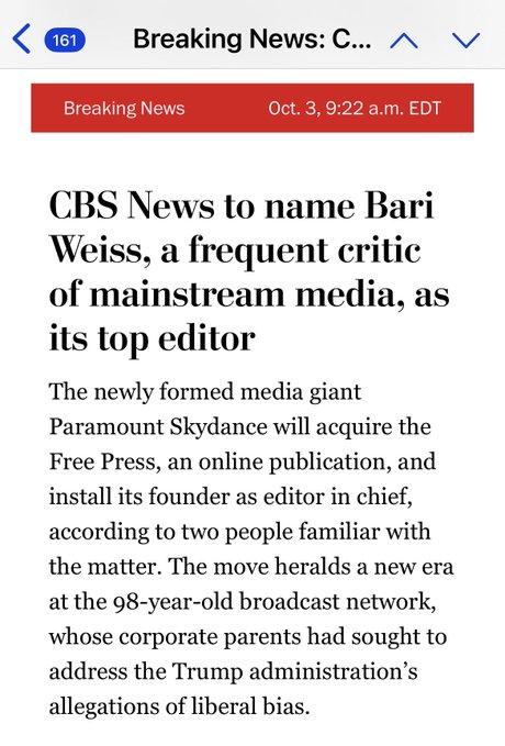 "David Ellison and Bari Weiss are known for their uncompromising support for Israel and demonization of Palestinians and their advocates," writes Eoin Higgins. https://theintercept.com/2025/10/03/cbs-news-bari-weiss-david-ellison/