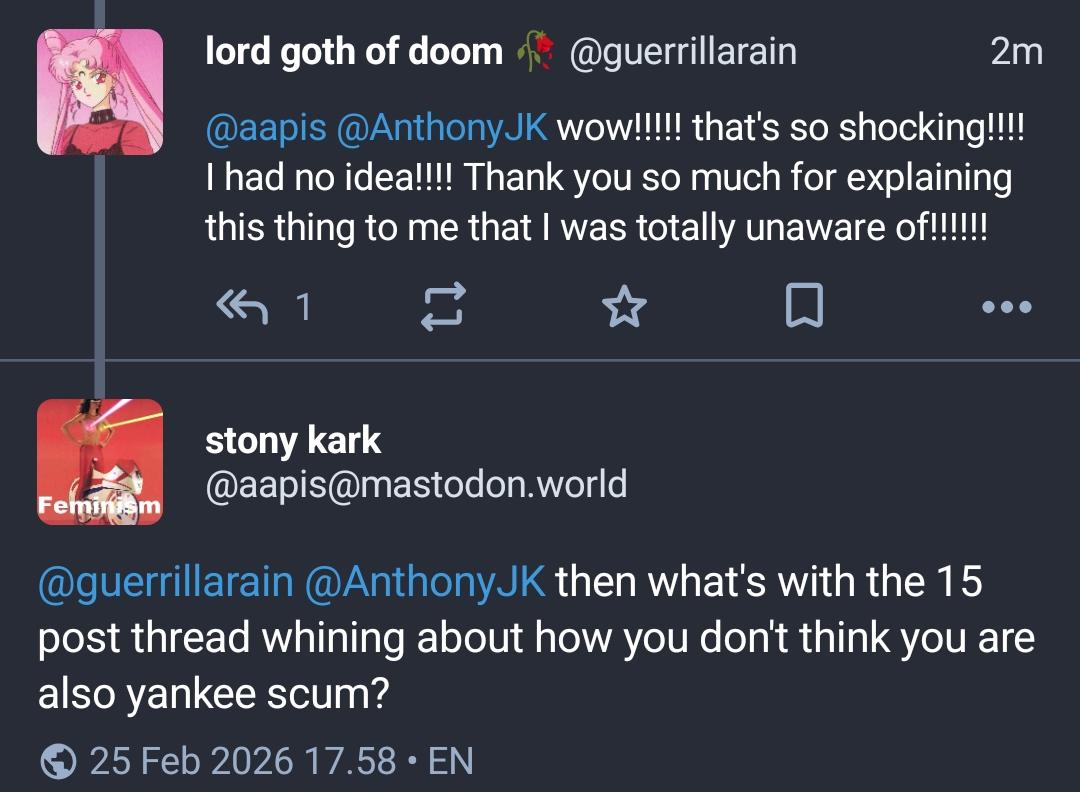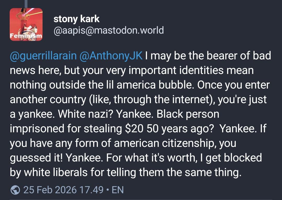 Something that I've noticed, both in the fediverse and other places, is that when marginalized people within the US complain about the US, non-USians arrive to remind us that we're still American, and therefore the ways we're marginalized don't matter and they don't care... in a way they do not talk to or respond to privileged Americans.