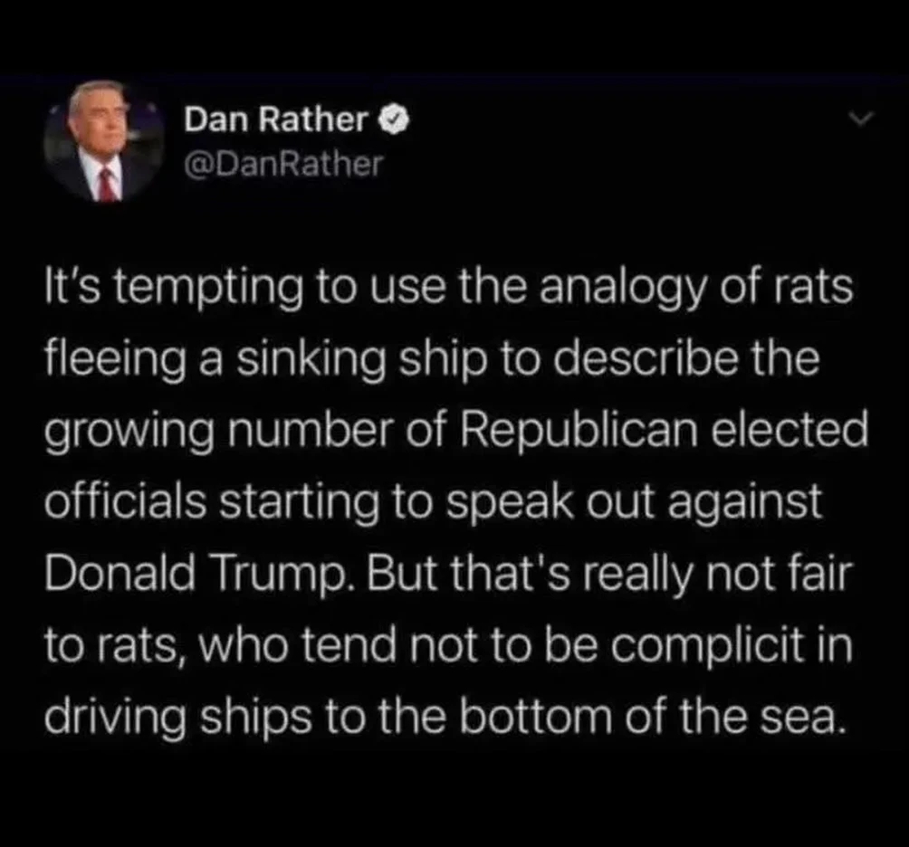 "It's tempting to use the analogy of rats fleeing a sinking ship to describe the growing number of Republican elected officials starting to speak out against Donald Trump. But that's really not fair to rats, who tend not to be complicit in driving ships to the bottom of the sea."