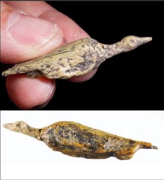 A 33,000 years old small carving of a bird, thought to be a diver, cormorant or duck. From beak to tail the figure is 4.7cm long. The sculpted piece of mammoth ivory, found in the Hohle Fels cave in Germany, may be the earliest representation of a bird.