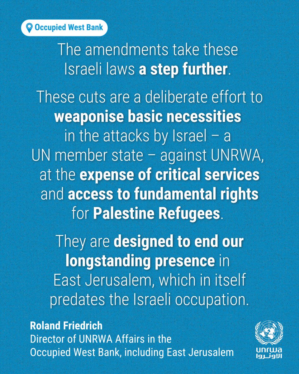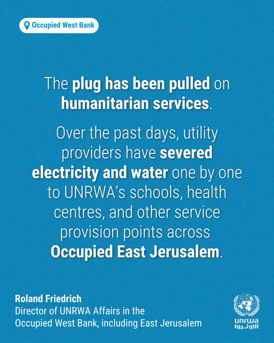 Over the past days, utility providers have severed electricity and water one by one to UNRWA’s schools, health centres, and other service provision points across occupied #EastJerusalem.