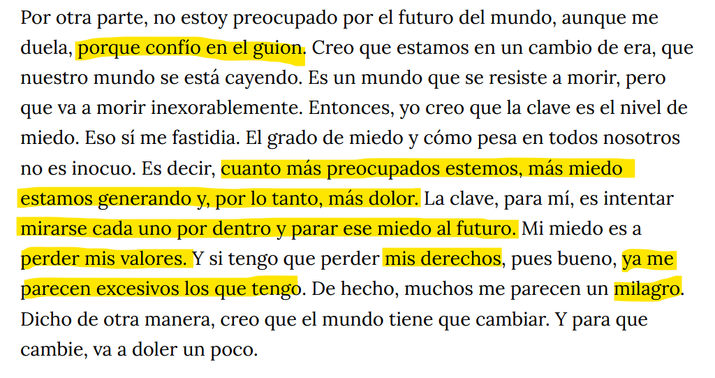 VAMOS A VER Óliver. CÓMO QUE CONFÍAS EN EL GUIÓN. QUÉ GUIÓN. ¡QUÉ GUIÓN! ¿Y eso de que mi miedo es el culpable y que tengo que mirar a mi interior? QUE MIRE MI JEFE A SU INTERIOR Y ME PAGUE DIGNAMENTE Y QUE ME BAJEN EL PRECIO DEL ALQUILER. Que no me preocupe dice el tío jaj dime si no es pa tener miedo la precariedad continua y absoluta y las guerras y el fascismo, Óliver de los cojones. Y confundes derechos con privilegios, Óliver. ¿¡EN QUÉ MOMENTO LOS DERECHOS SON EXCESIVOS ÓLIVER?! AAHHH JIPI