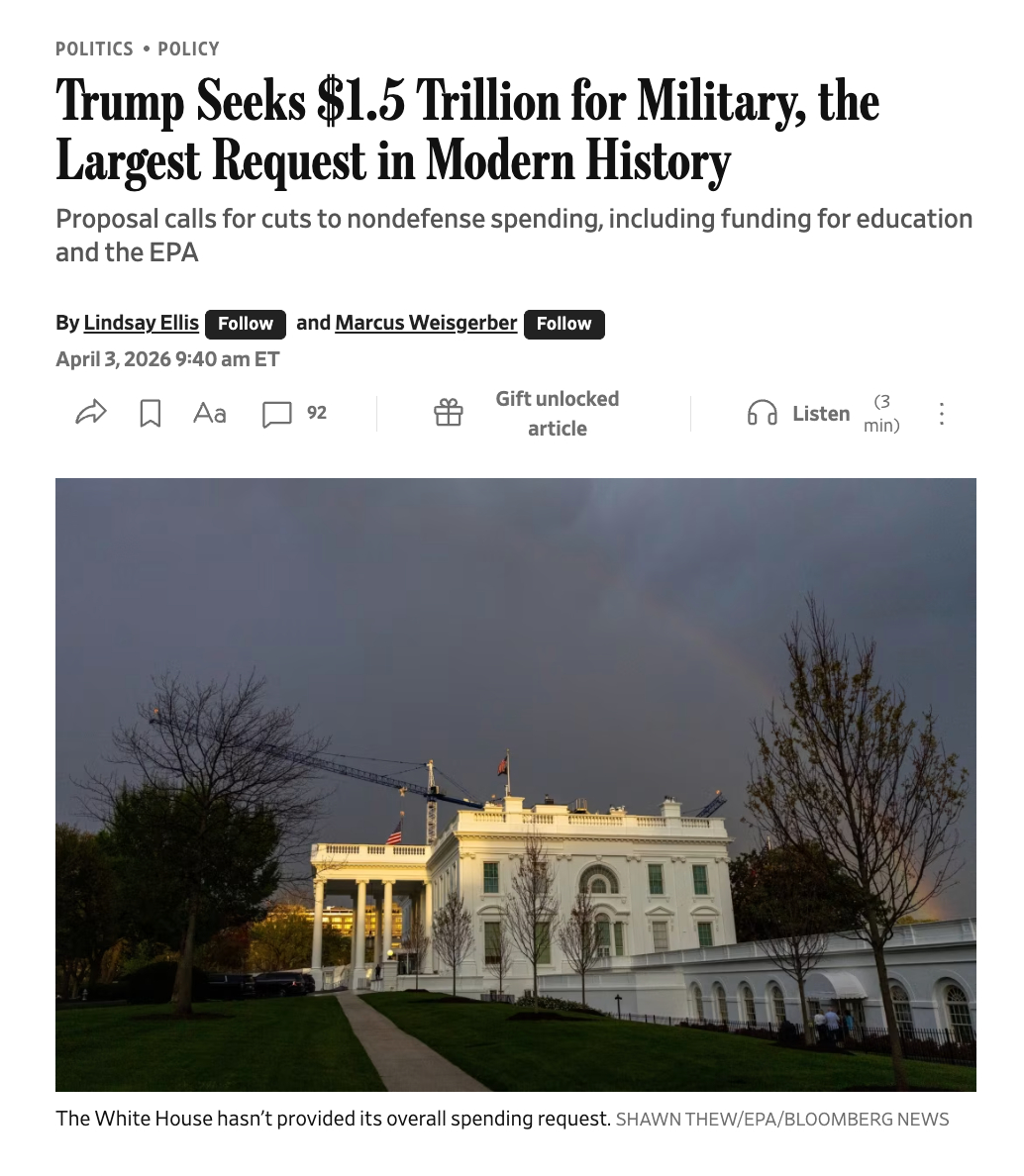 Associated Press: "Pres. Donald Trump proposed boosting defense spending to $1.5 trillion in his 2027 budget released Friday, the largest such request in decades."