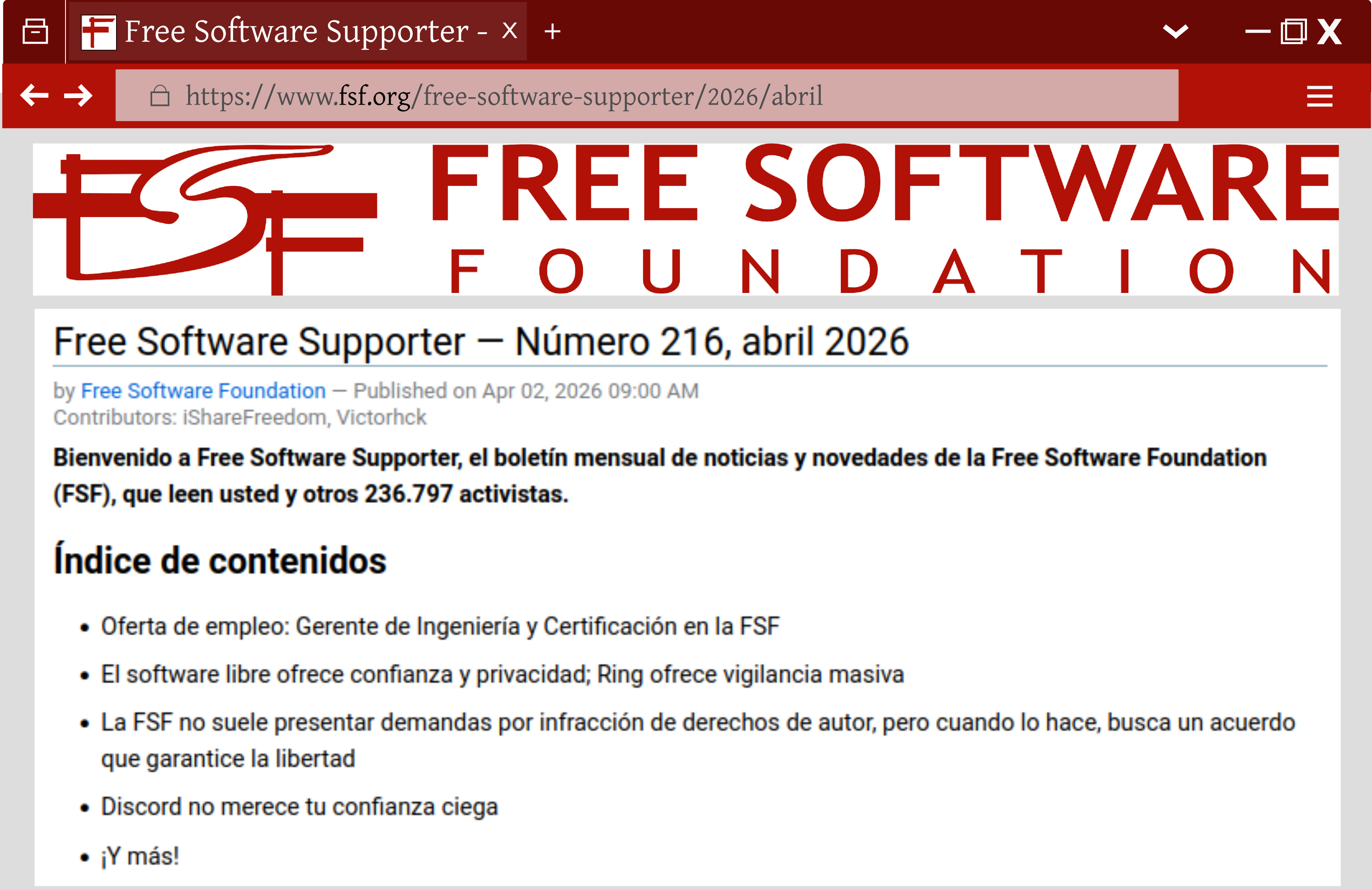 El Free Software Supporter está disponible en español. Para ver la versión en español haz click aqui: fsf.org/free-software-supporte