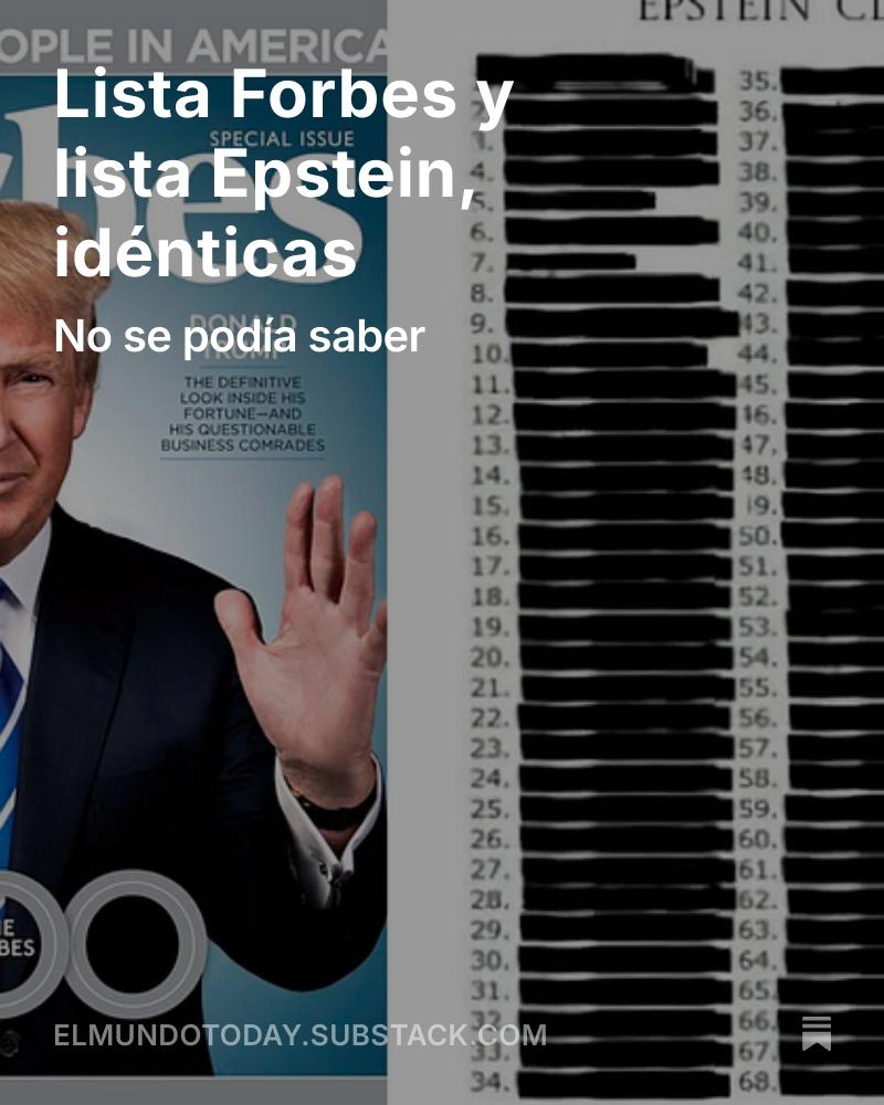 Nuestro boletín gratuito de los domingos ya está aquí. Apúntate para que llegue a tu correo. https://elmundotoday.substack.com/p/lista-forbes-y-lista-epstein-identicas