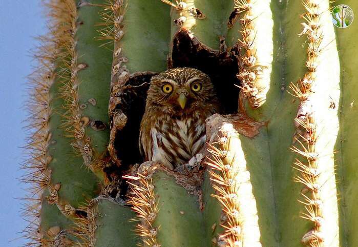 Сычик-эльф или кактусовый сыч - самая маленькая сова в мире, родом из Северной Америки. Ее длина тела около 12—14 см, вес — около 44 г. Крошечный сычик-эльф часто гнездится в дуплах огромных кактусов.