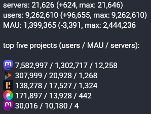 @Vinni_pouch @san Думается, плеромы с мискеями вообще можно не считать, там на 2 порядка меньше людей, чем в Мастодоне. Так что, да, пара тысяч MAU получается.