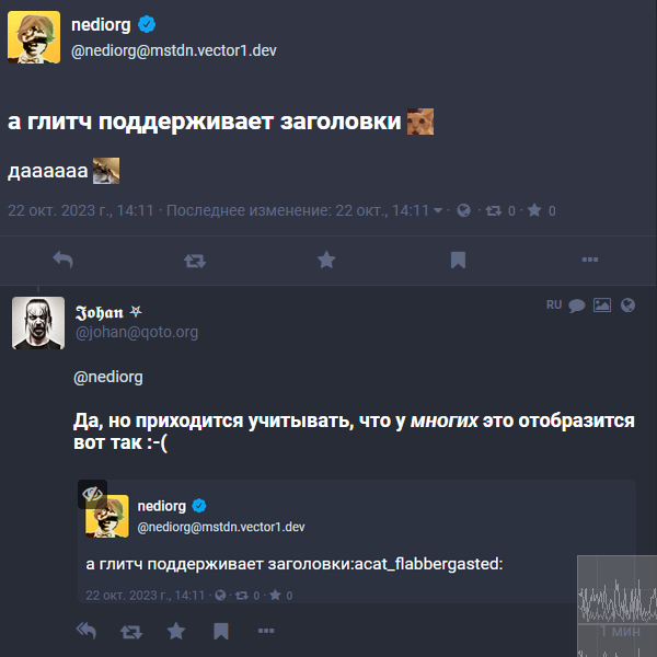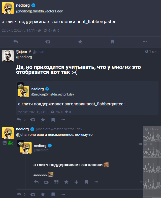 @nediorg Не устаканили еще стандарты на Markdown :-( На первом скрине — glitch, на втором как я вижу это в qoto.