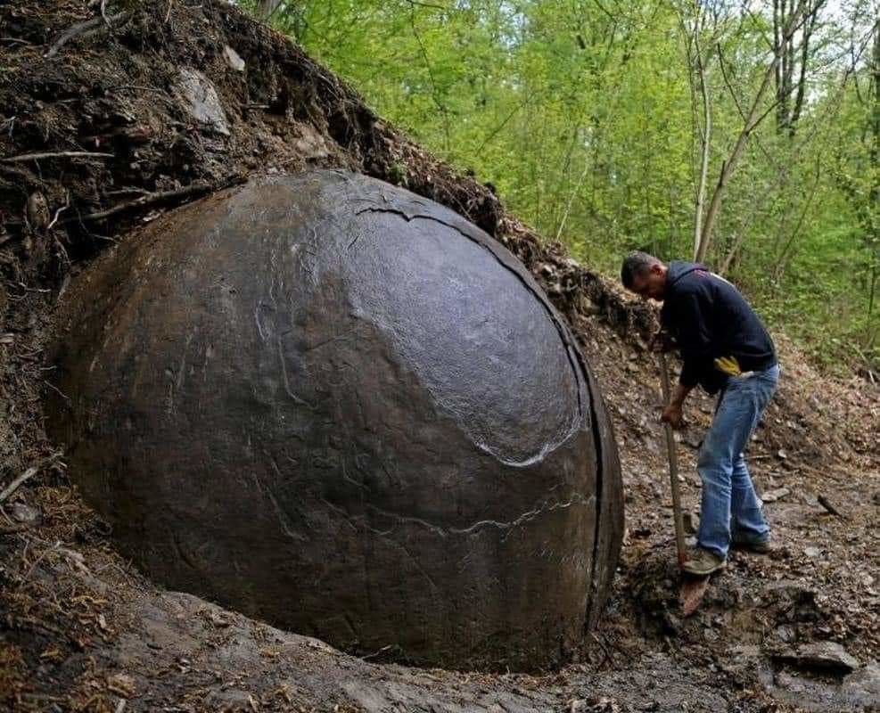 This 60 ton Giant stone sphere was found in Bosnia (2016.) There used to be 80 of these stone balls, but most of them were destroyed when rumors started circling among locals that gold was hidden inside them. Just eight remain now. With the latest discovery being the largest. The brown and red color of the ball may indicate to very high content of the iron.