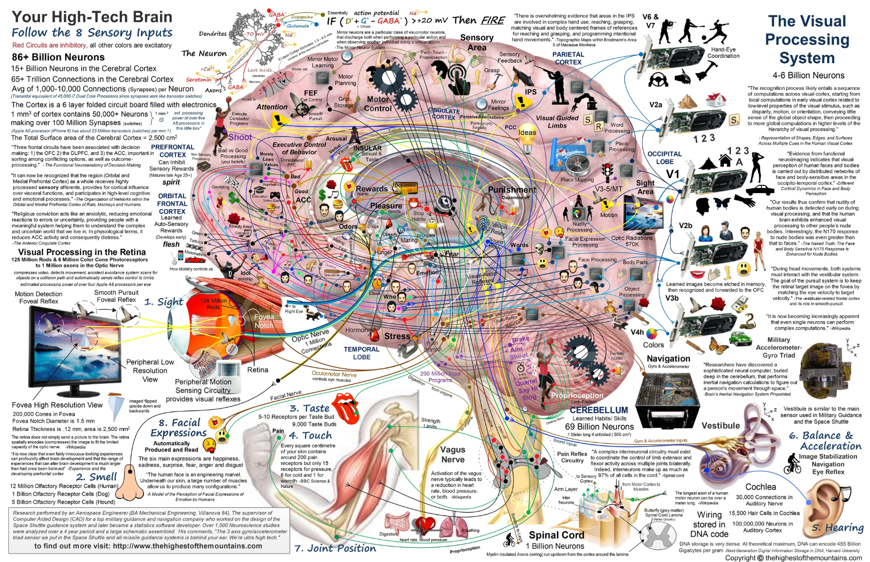Поглядите, какая замечательная и подробная карта человеческого мозга! Точнее, карта наших нынешних знаний о нём, - наверняка она, как средневековые карты, ещё очень наивна и во-многом не верна, зато помогает сориентироваться в этом трёхмерном лабиринте нейронных связей. Сам давно такое мечтал сделать, может ещё и сделаю русскую версию.