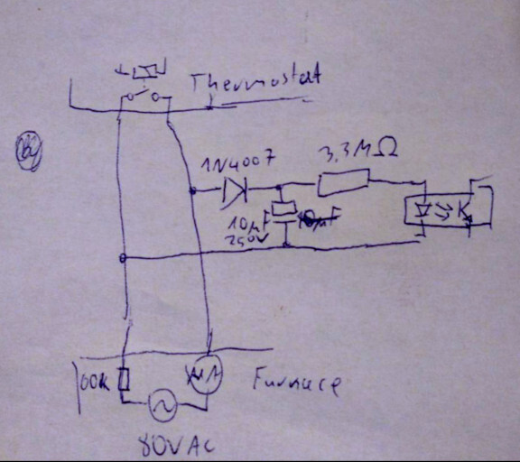 With the PC817 optocoupler, that requires 100uA on the input, which is IMO kinda close to the 300uA that turns on the heating... I'd much rather pull only 30uA from the furnace's control line.