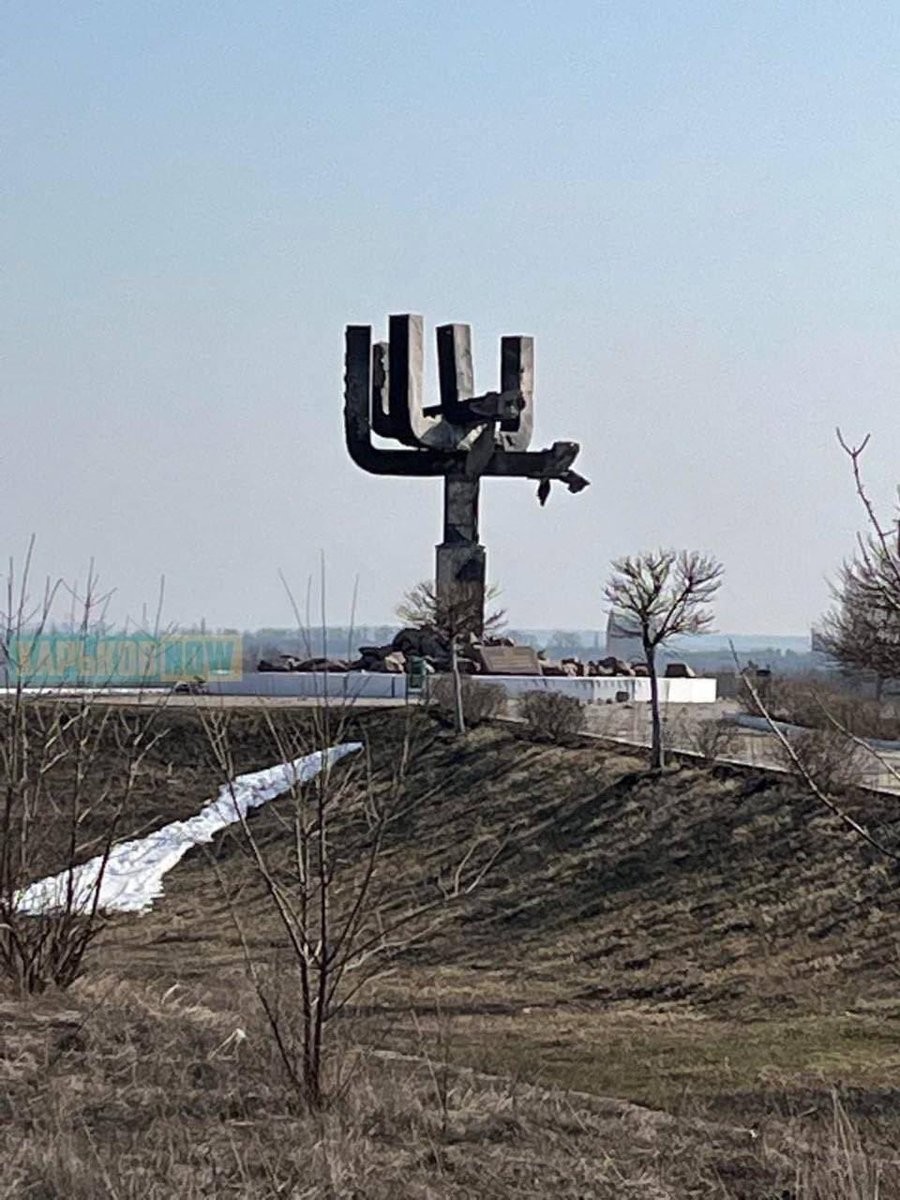 This Menora in Drobytskyi Yar near Kharkiv never threatened anyone. It commemorates the memory of over 15.000 Jews murdered by Nazis. Damaged by Russian shelling today. Why Russia keeps attacking Holocaust Memorials in Ukraine? I expect Israel to strongly condemn this barbarism.