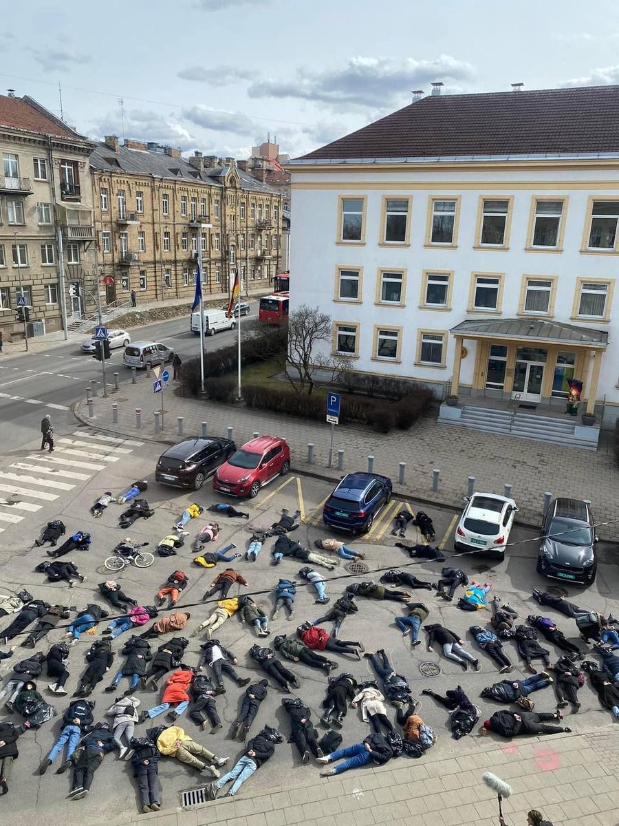 At the end of the rally, the participants lay down on the ground to honor the memory of all those killed in the Russian invasion.