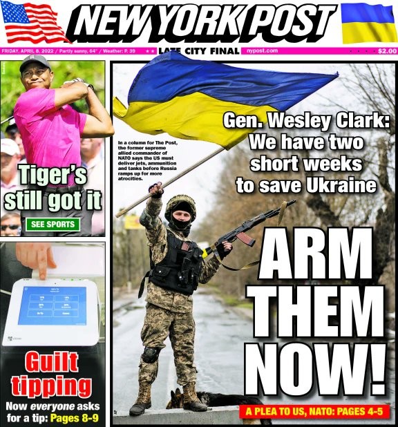 The great @GeneralClark has today's @nypost cover with his powerful plea for Ukraine. As he wrote in sharing his piece on Twitter, "Please read and help, each in his or her own way! This is our fight for democracy and freedom." Read his piece here: https://nypost.com/2022/04/07/the-time-to-arm-ukraine-is-right-now-crucial-window-for-kyiv-and-the-world/