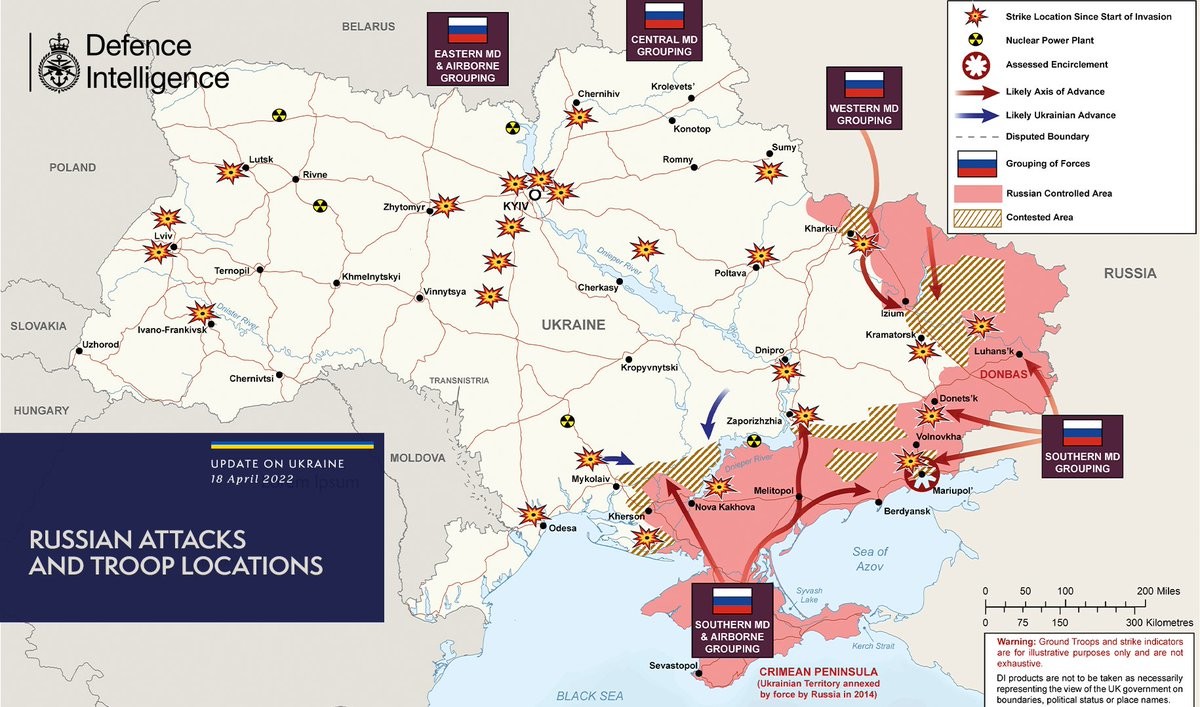 The map below is the latest Defence Intelligence update on the situation in Ukraine - 18 April 2022