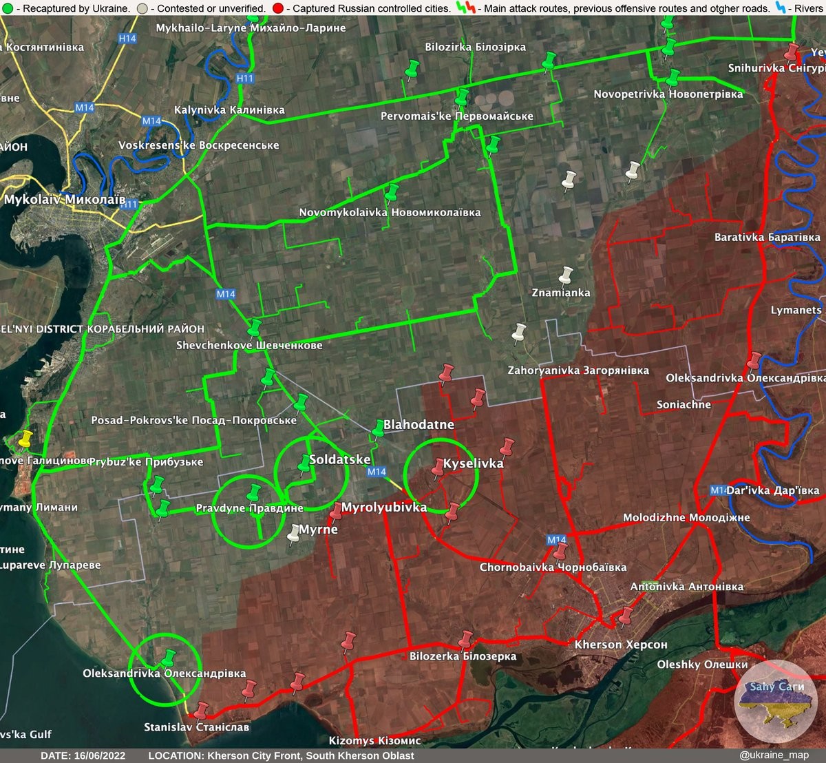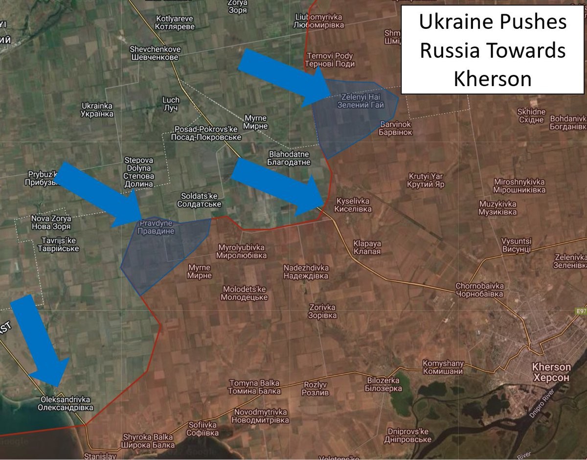 - troops have pushed forces back towards Kherson & captured the towns of Pravdyne, Zelenyi Hai & Oleksandrivka. is currently assaulting towards Kyselivka along the -Kherson Highway & toward Tomyna Balka. Heavy shelling continues.