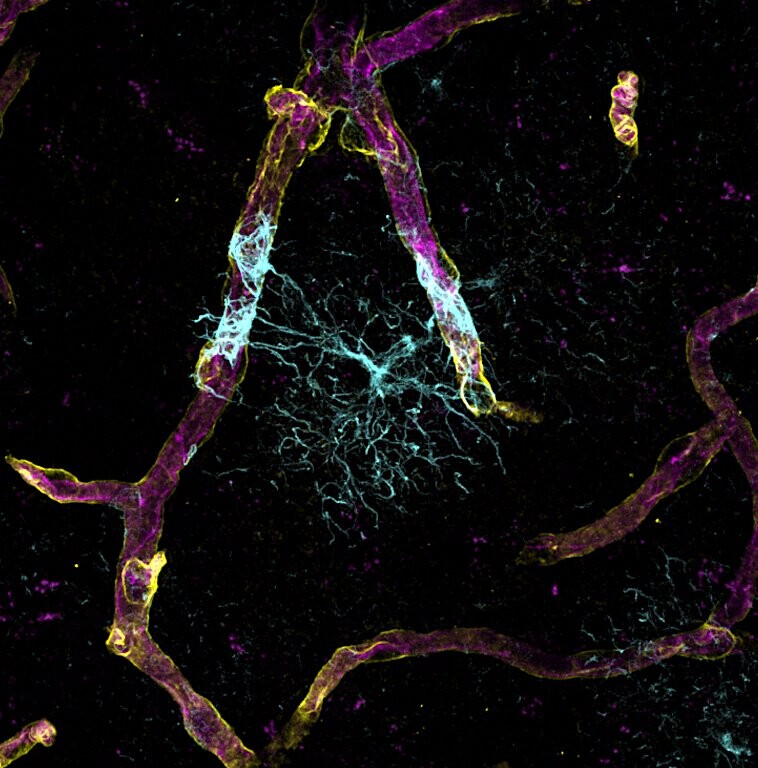 New research direction = new #FluorescenceFriday drop! Stunning astrocyte (GFAP, Cyan) wrapped around a branched blood vessel (Tomato Lectin, Magenta). Astrocyte endfeet in yellow (AQP4).
