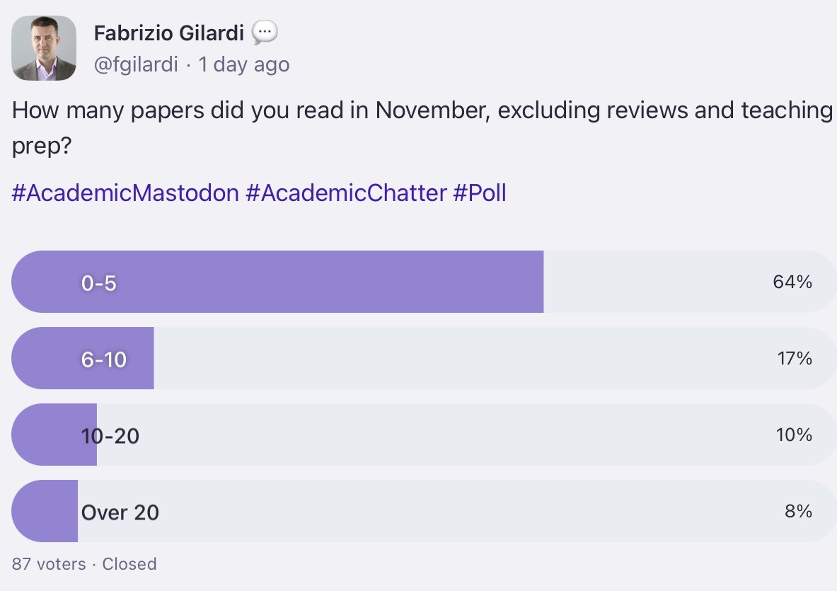 @fgilardi #AcademicMastodon @academicchatter Interesting question. I guess it also depends on what each of the respondent mean by "read" exactly. On my side, I skim through many papers each month but I give a careful read to max 6-10 papers a month (i.e. reading line by line, annotating, and indexing the paper in my database with some useful metadata).