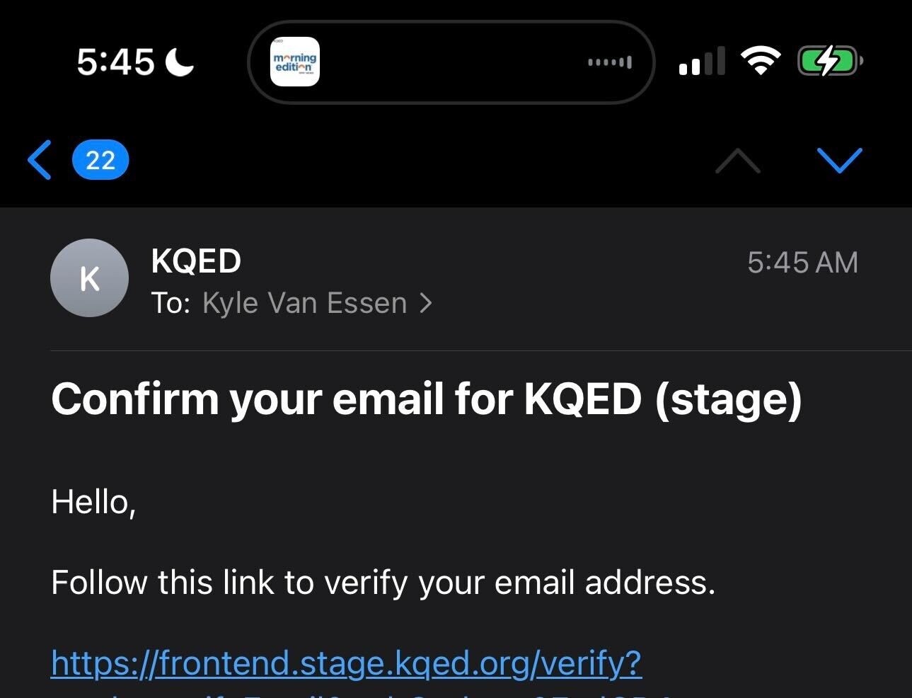 Was wondering why I got signed out of the KQED app, and then couldn’t sign in again. I think they shipped a version of their app that accidentally points at their staging environment. Happens to the best of us at least once!