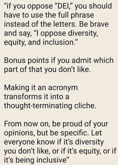如果你反对“DEI”,那么你应该直接说出完整的词,而不是只用缩写。要勇敢地说:“我反对多元化、公平和包容。” 如果你能坦诚地说出自己不喜欢哪一部分,那就更好了。 把它变成缩写只会让它成为一个终结思考的陈词滥调。 从现在开始,勇敢表达你的观点,但要具体。让所有人都知道,你到底是反对多元化,还是公平,还是包容? x.com/muqjm0t7kwtm...
