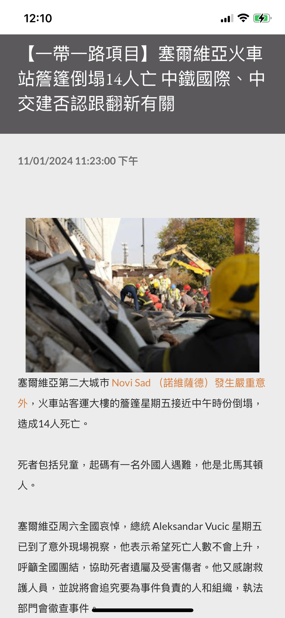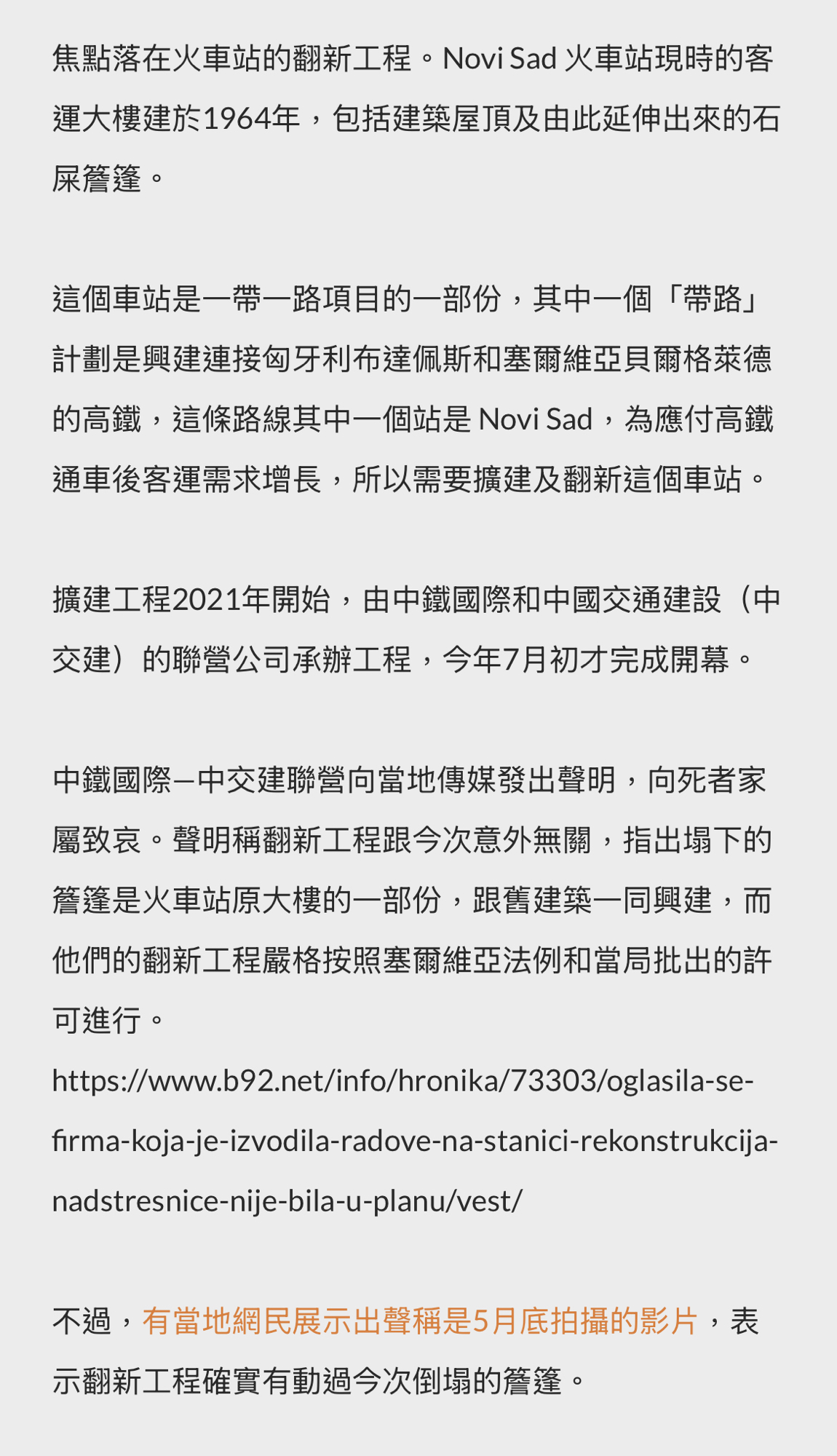 輸出豆腐渣工程還有一例是塞爾維亞,中鐵公司的一帶一路項目翻修舊火車站後,去年11月火車站檐篷倒塌造成15人死亡,中國雖然否認與工程有關,當地網民卻找到了證據。