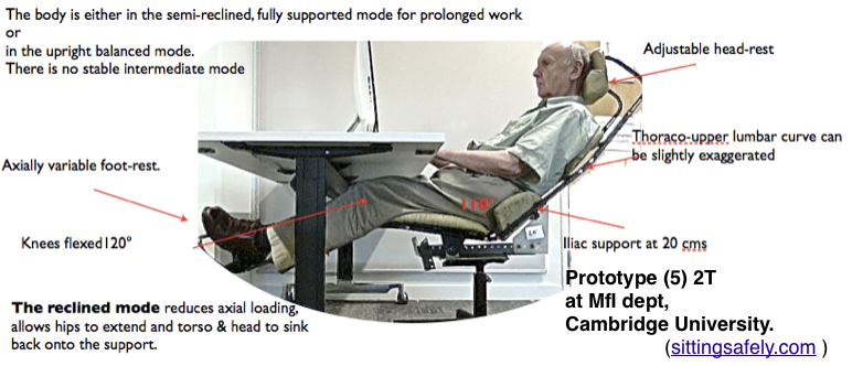 There are actually 2-3 arguable solutions to this. My company prefer the reclined position and provides foot rests onsite. Additionally, we have notifications every once in a while that locks our screens to force us to get up and stretch to avoid leg/back pain.