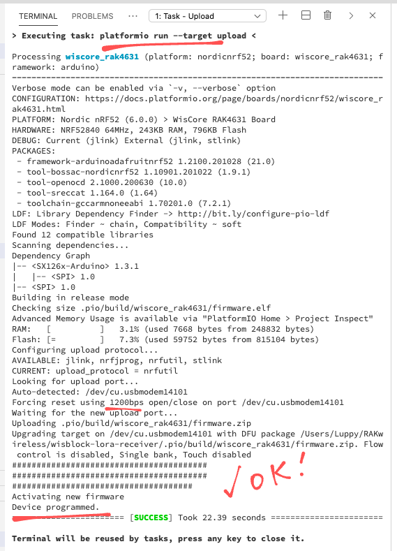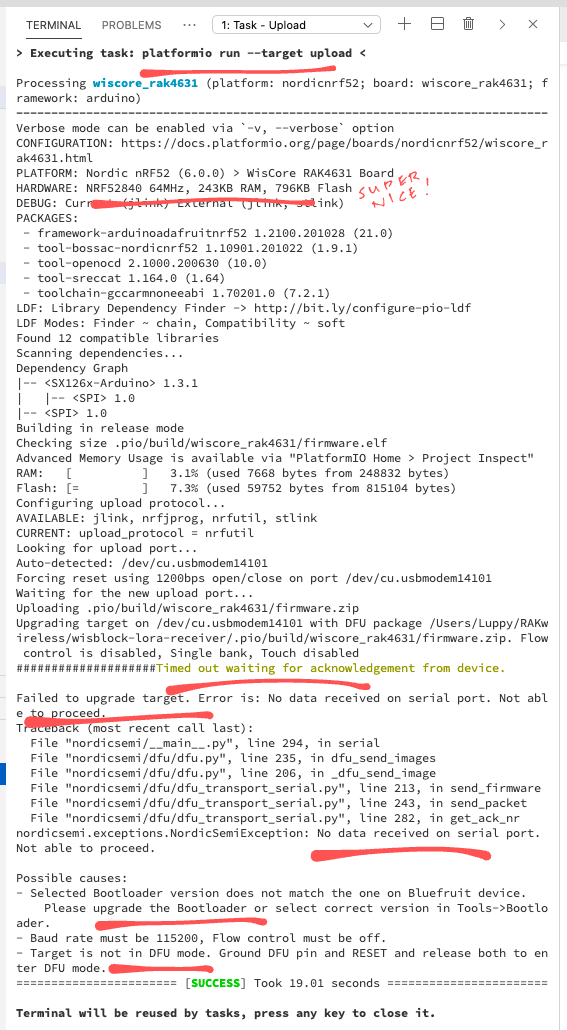 And now PlatformIO flashes OK to #WisBlock! ... Maybe earlier I was staring at the WisBlock lights too long and it timed out 🤔
