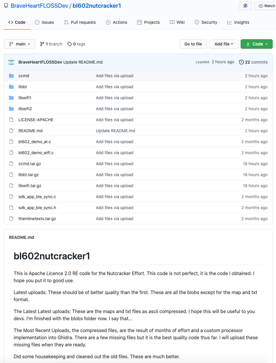 @lupyuen That's so much cleaner than the first version uploaded. It was also using a custom ported Processor that is also in the repository but not yet available in Ghidra. I'm just glad that you are finding it useful. Libwifi should contain 112 object files but 6 were excluded because of errors, I'll get them up when I can get them decompiled.