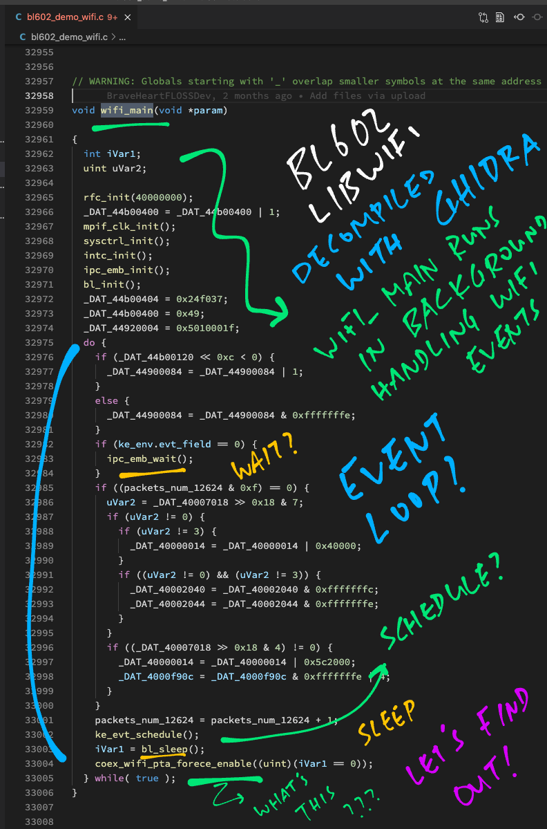 "wifi_main" lives in the mysterious #BL602 #WiFi Library "libwifi" ... Let's study the decompiled C code (thanks to BraveHeartFLOSSDev and Ghidra)