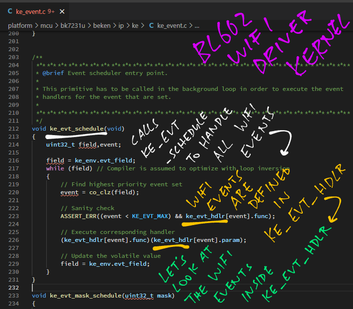 #BL602 "wifi_main" calls "ke_evt_schedule" to do #WiFi Tasks ... GitHub Search shows that "ke_evt_schedule" is also defined in ... AliOS! 😲