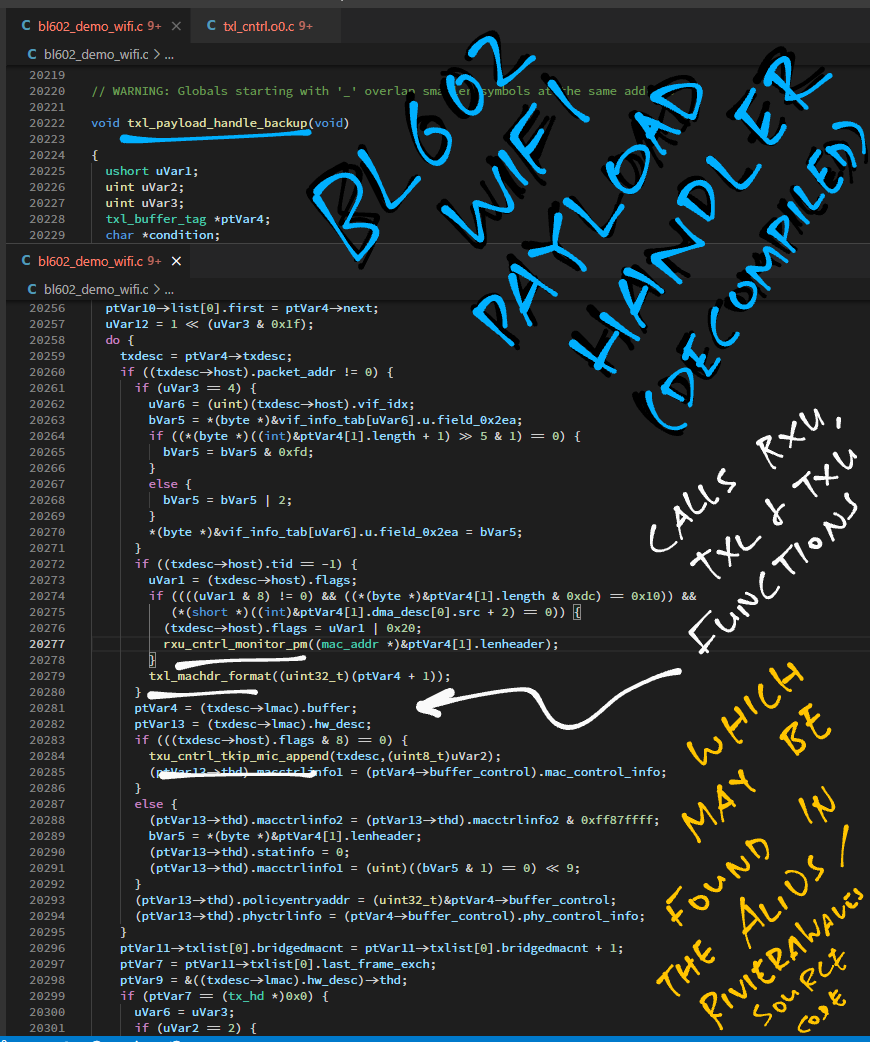 #BL602 #WiFi Payload Handler calls rxu, txl and txu functions ... Fortunately these are defined in the AliOS / RivieraWaves Source Code we saw earlier