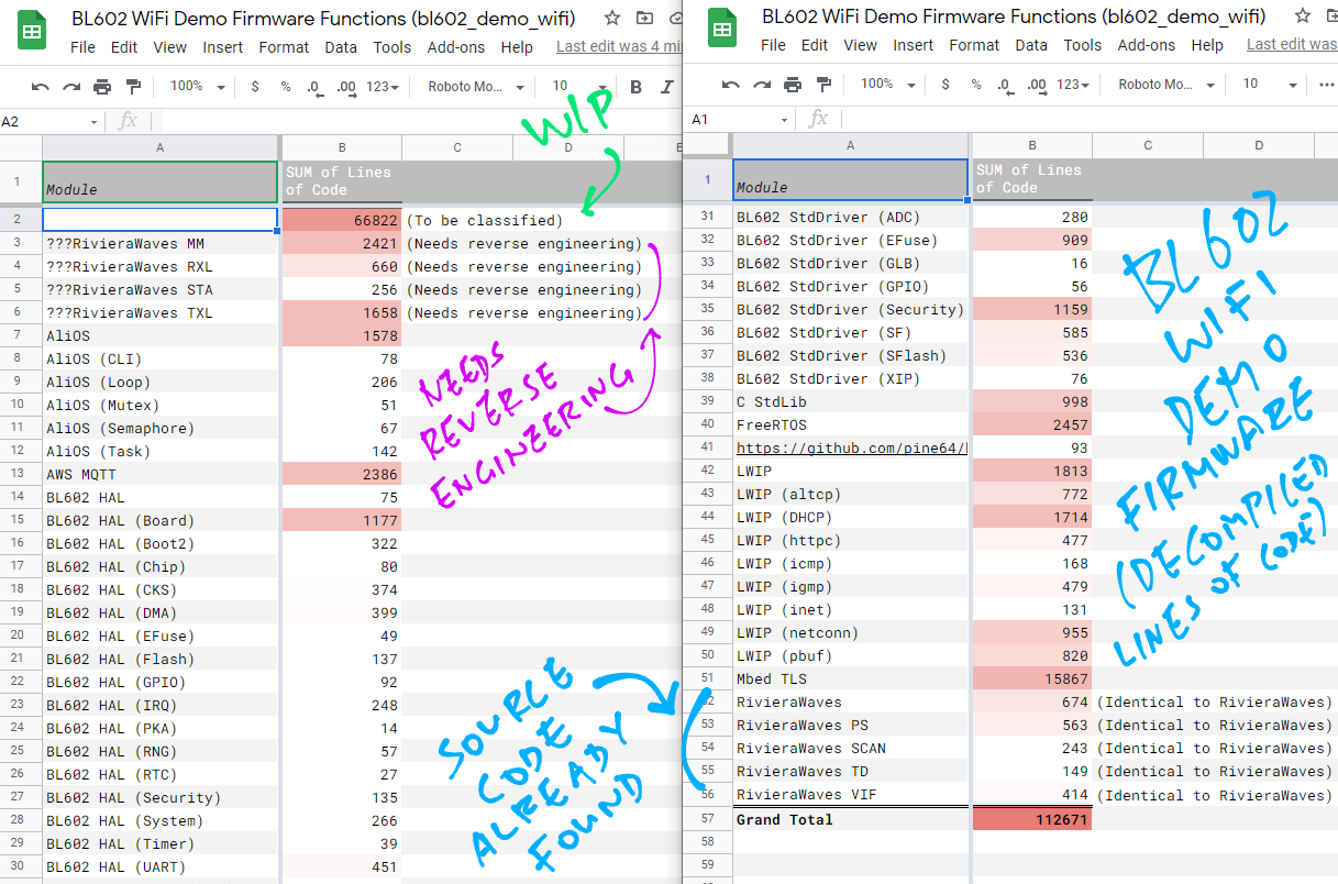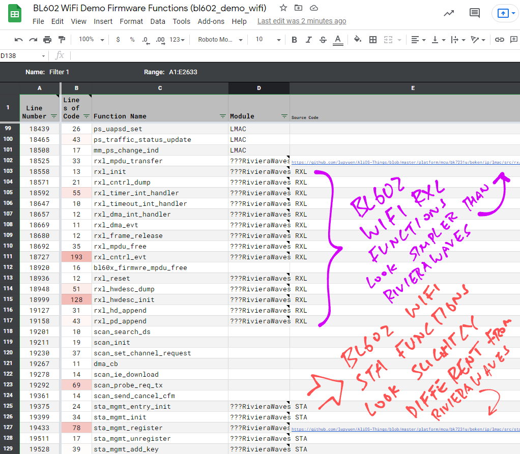 Load the Decompiled #BL602 #WiFi Functions into a spreadsheet ... For easier crunching