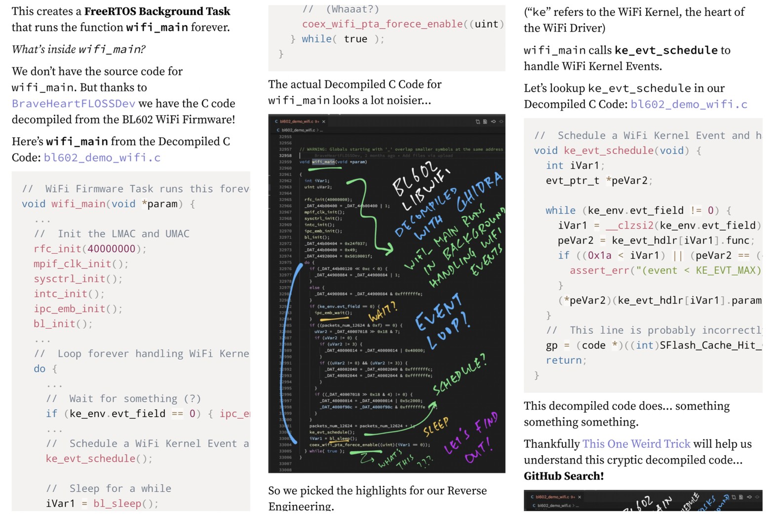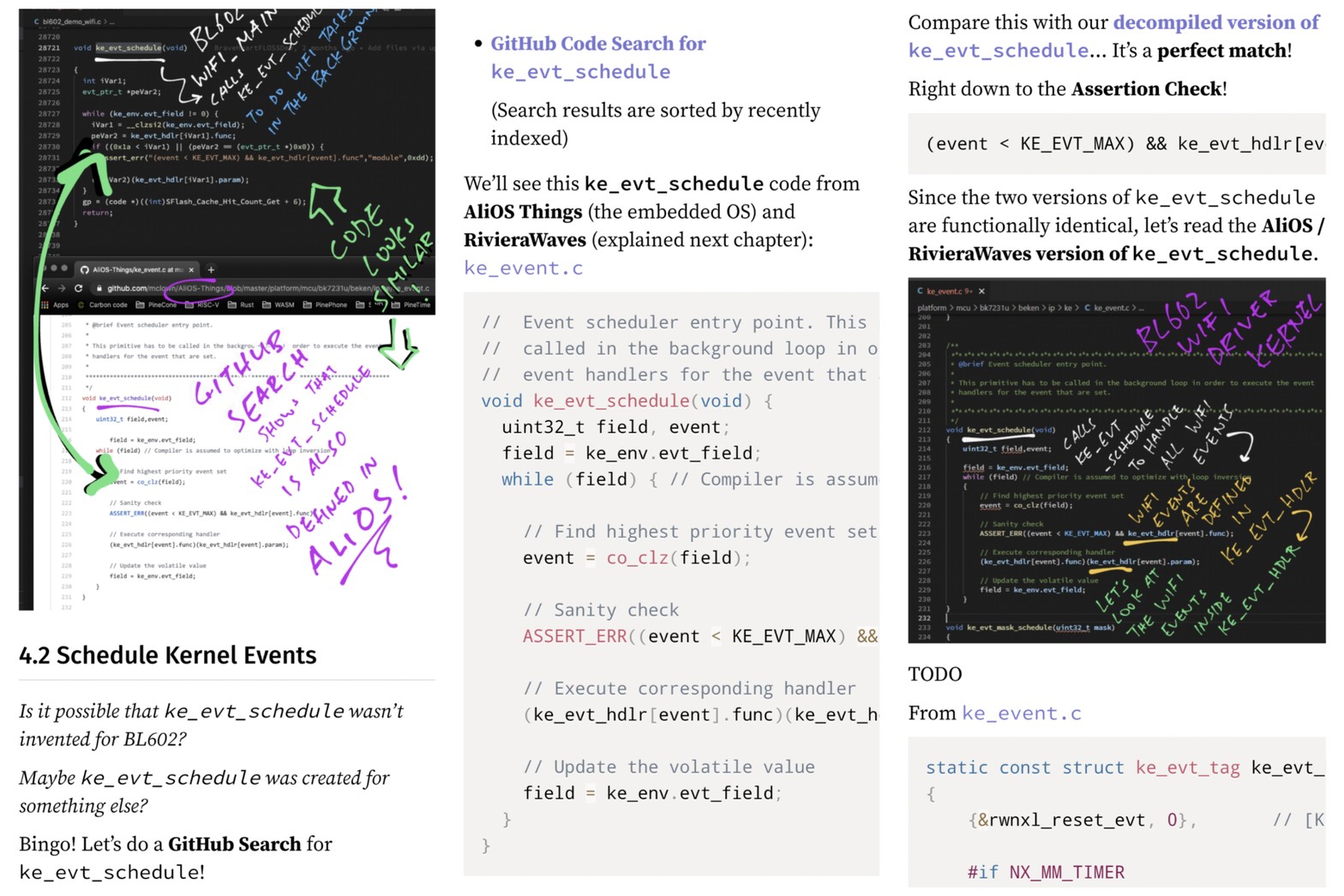 "wifi_main" calls "ke_evt_schedule" to do Tasks ... GitHub Search shows that "ke_evt_schedule" is also defined in ... AliOS! 😲
