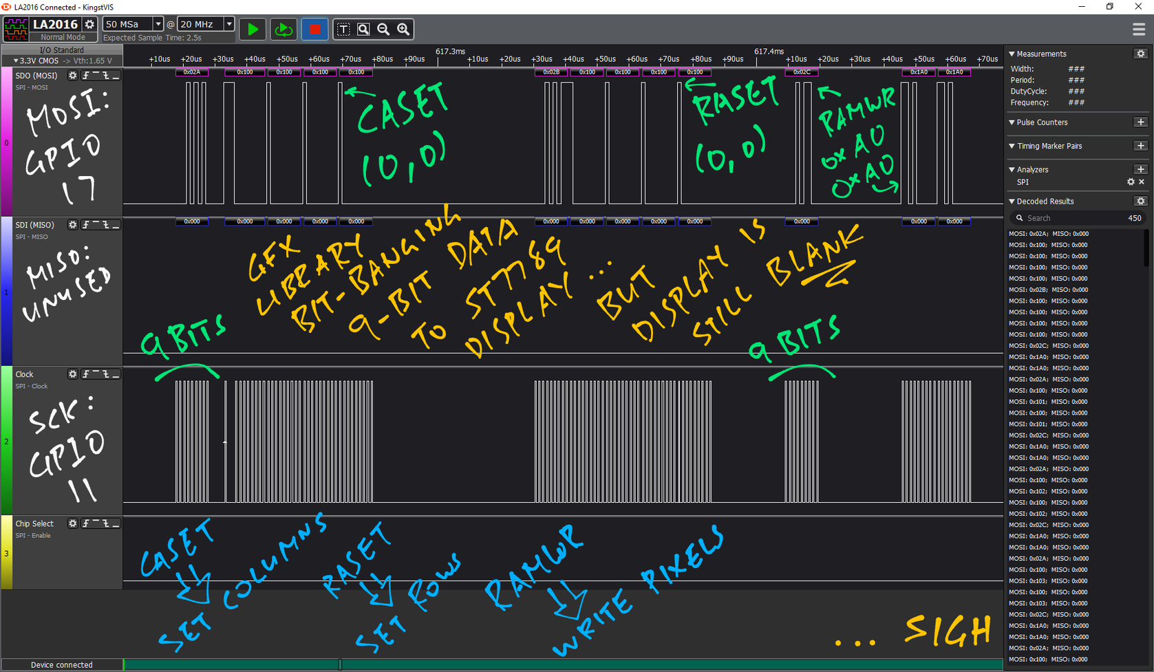 Let's port moononournation's awesome 9-bit-banging GFX Library to #BL604 ... And compare the SPI Output with a Logic Analyser