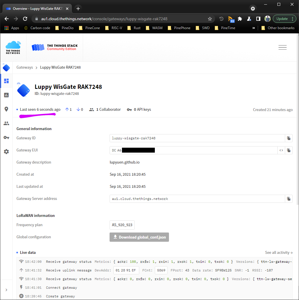 Checking ChirpStack #LoRaWAN Gateway ... For packets transmitted by #PineDio Stack BL604