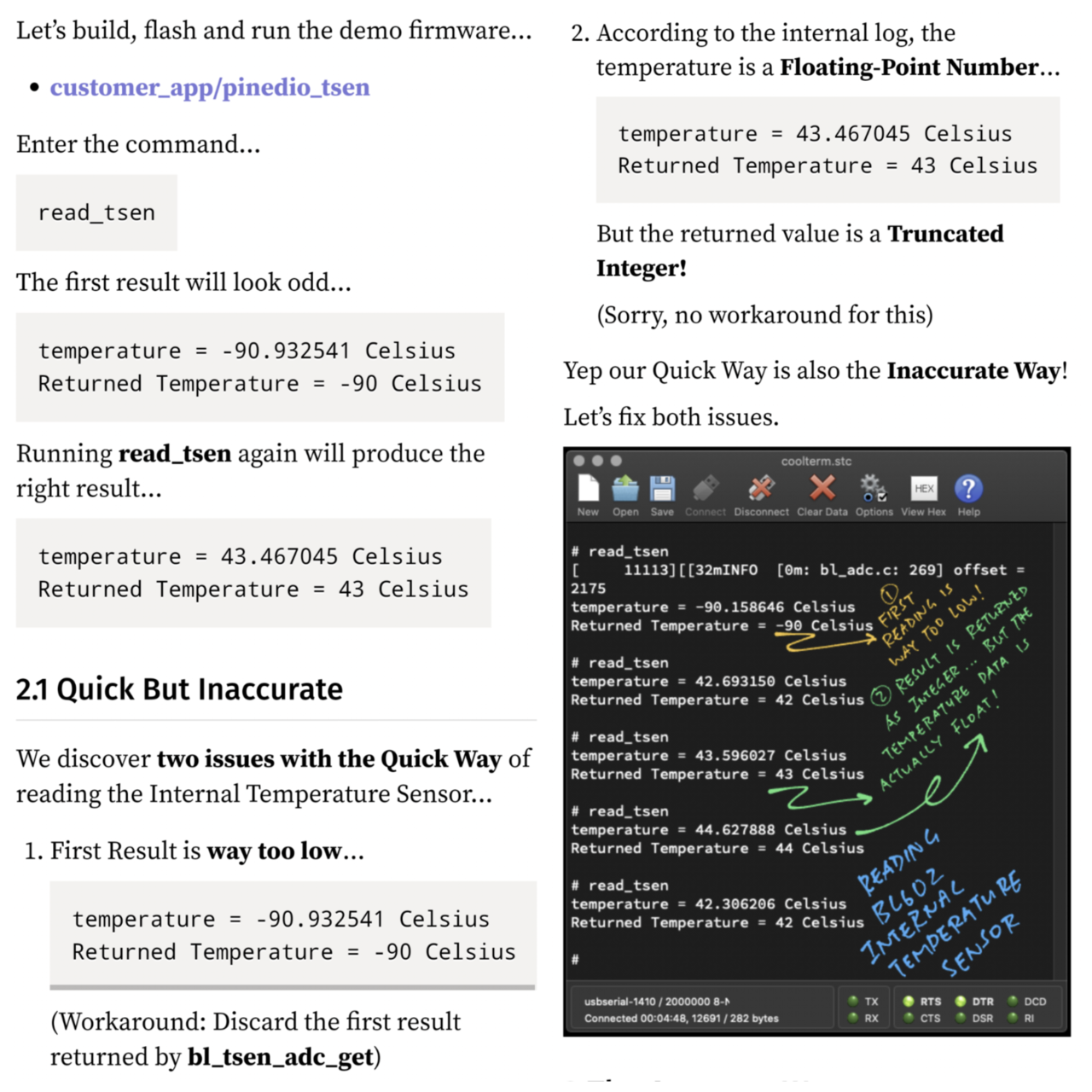 Reading Internal Temperature Sensor with "bl_tsen_adc_get" has 2 issues ... 1️⃣ First reading is always too low ... 2️⃣ Result is returned as Integer even though the reading is actually Float