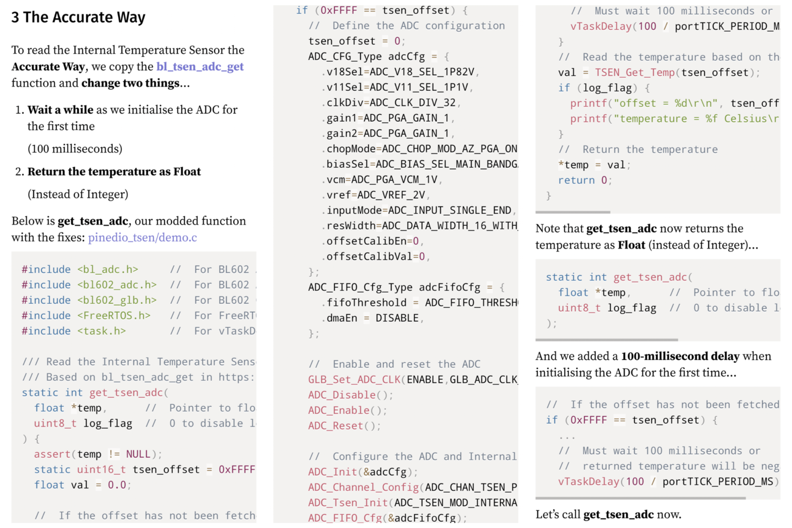 Let's copy "bl_tsen_adc_get" from ADC HAL and fix the issues ... 1️⃣ Temperature is now returned as Float (not Integer) ... 2️⃣ Insert a delay during init to fix the first reading
