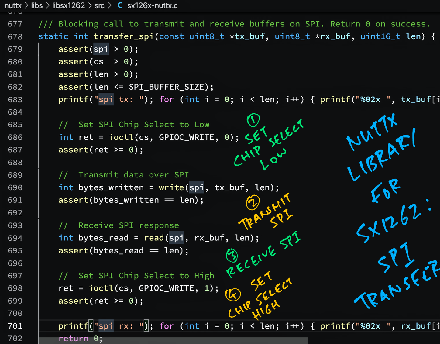 Our #NuttX SX1262 Library transfers SPI Data by calling the SPI Test Driver