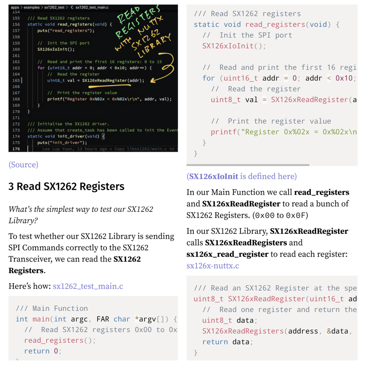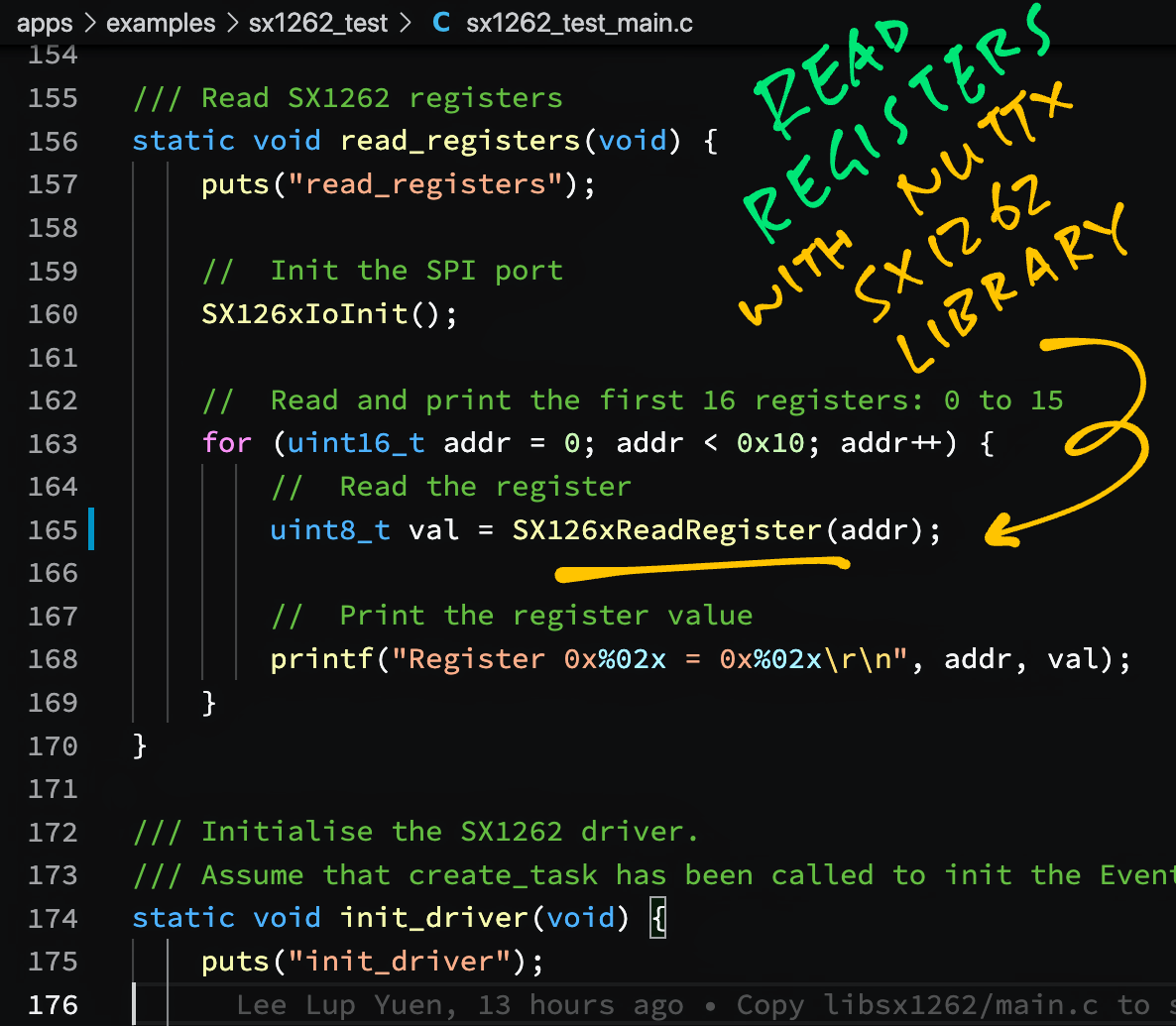 How we call our #NuttX #LoRa Library ... To read the SX1262 Registers