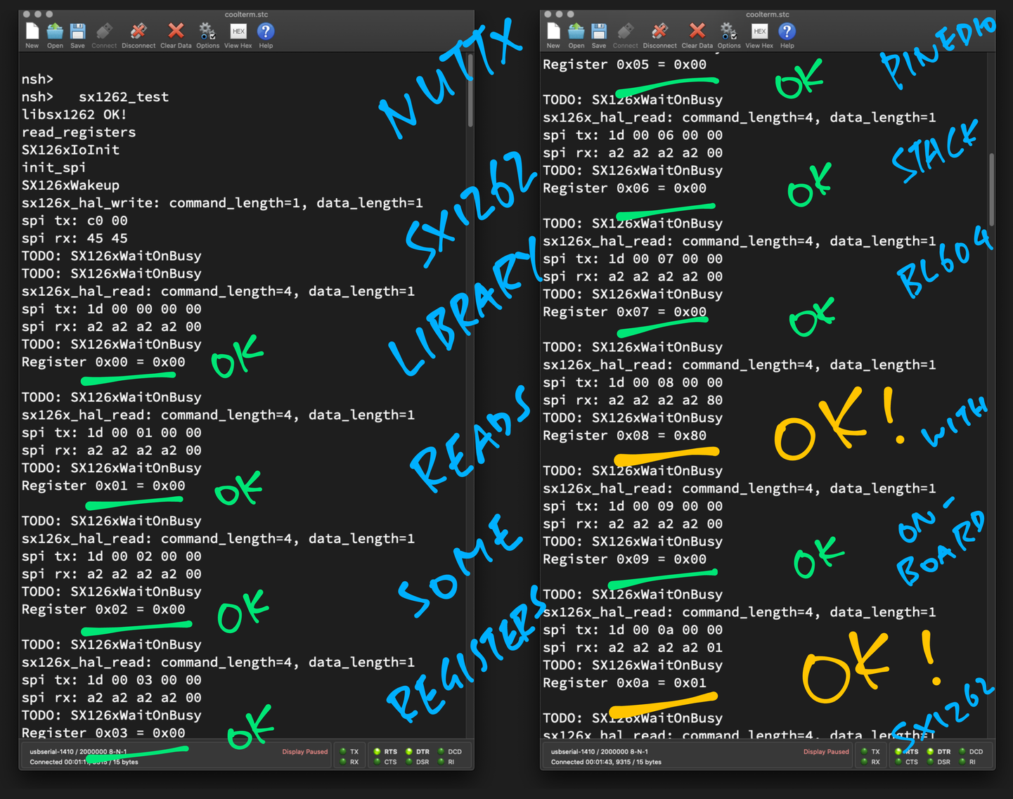 Yep our #NuttX SX1262 Library reads the SX1262 Registers correctly! 🎉