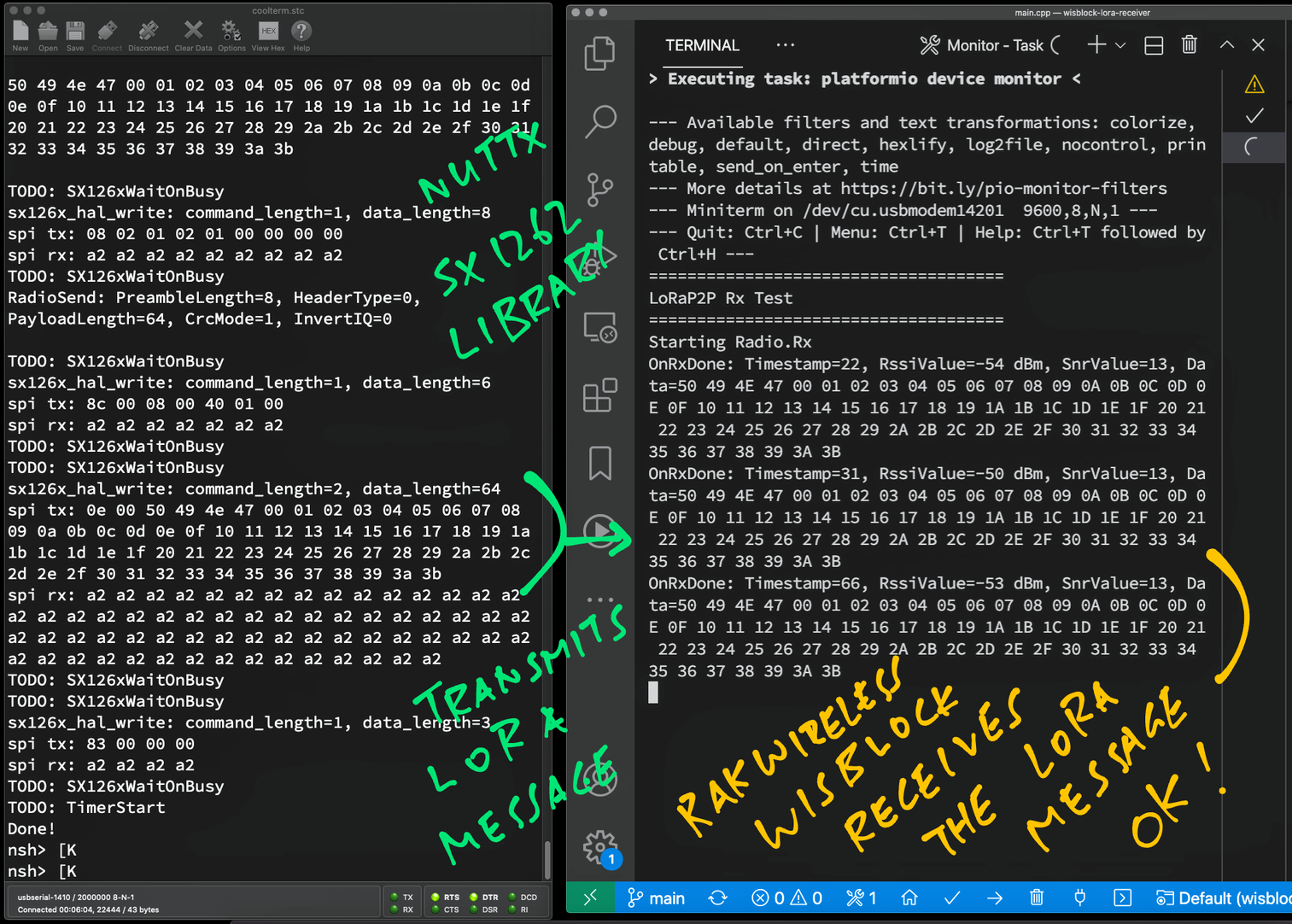 Our #NuttX SX1262 Library correctly receives the #LoRa Message transmitted by #RAKwireless WisBlock! 🎉