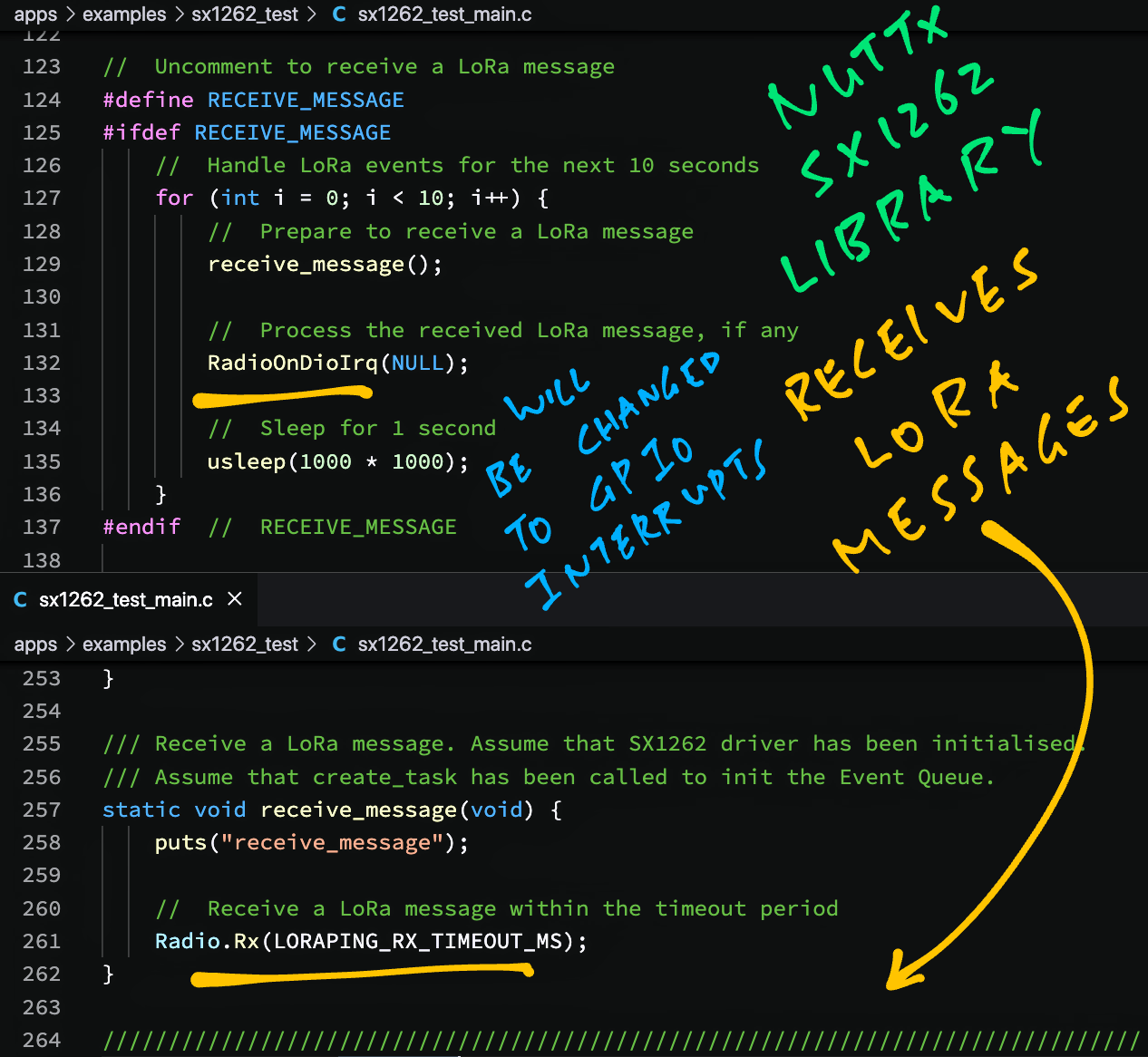Calling our #NuttX SX1262 Library to receive a #LoRa Message