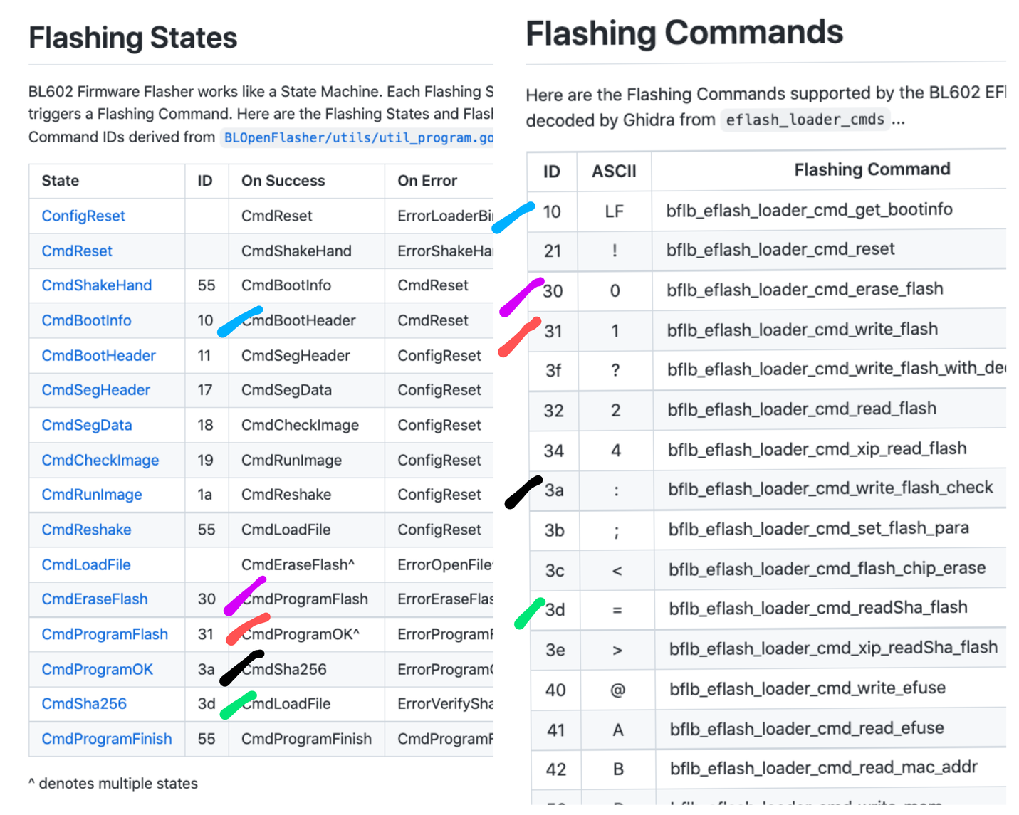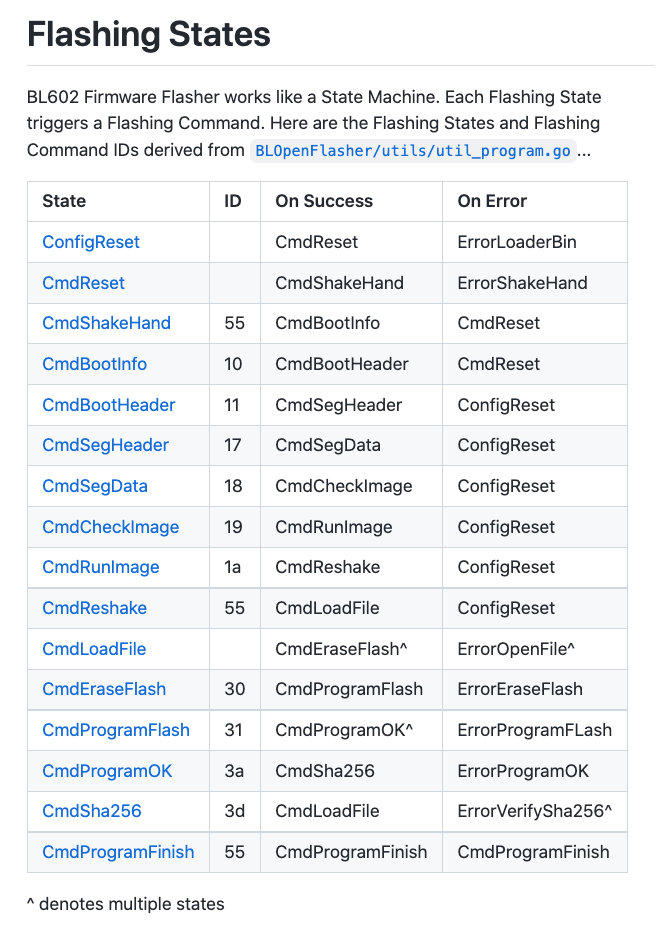 Here are the #BL602 Flashing States and Flashing Command IDs derived from the BL602 Firmware Flasher (BLOpenFlasher)