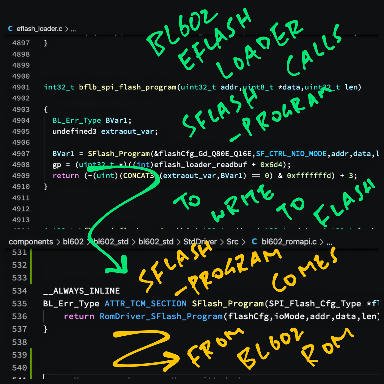 #BL602 EFlash Loader calls SFlash_Program to write to flash ... SFlash_Program is defined in the BL602 ROM ... Thanks to the decompiled code we now know how EFlash Loader works! 👍