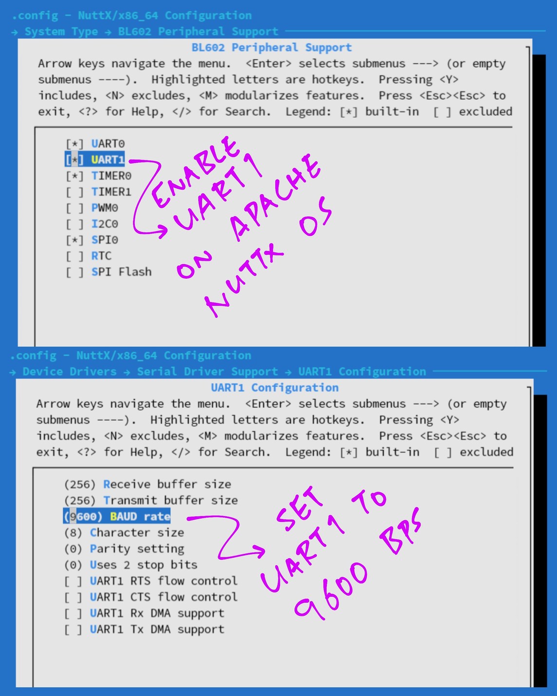 Configure Apache #NuttX OS to enable UART1 for 9600 bps ... So NuttX can talk to IKEA Air Quality Sensor